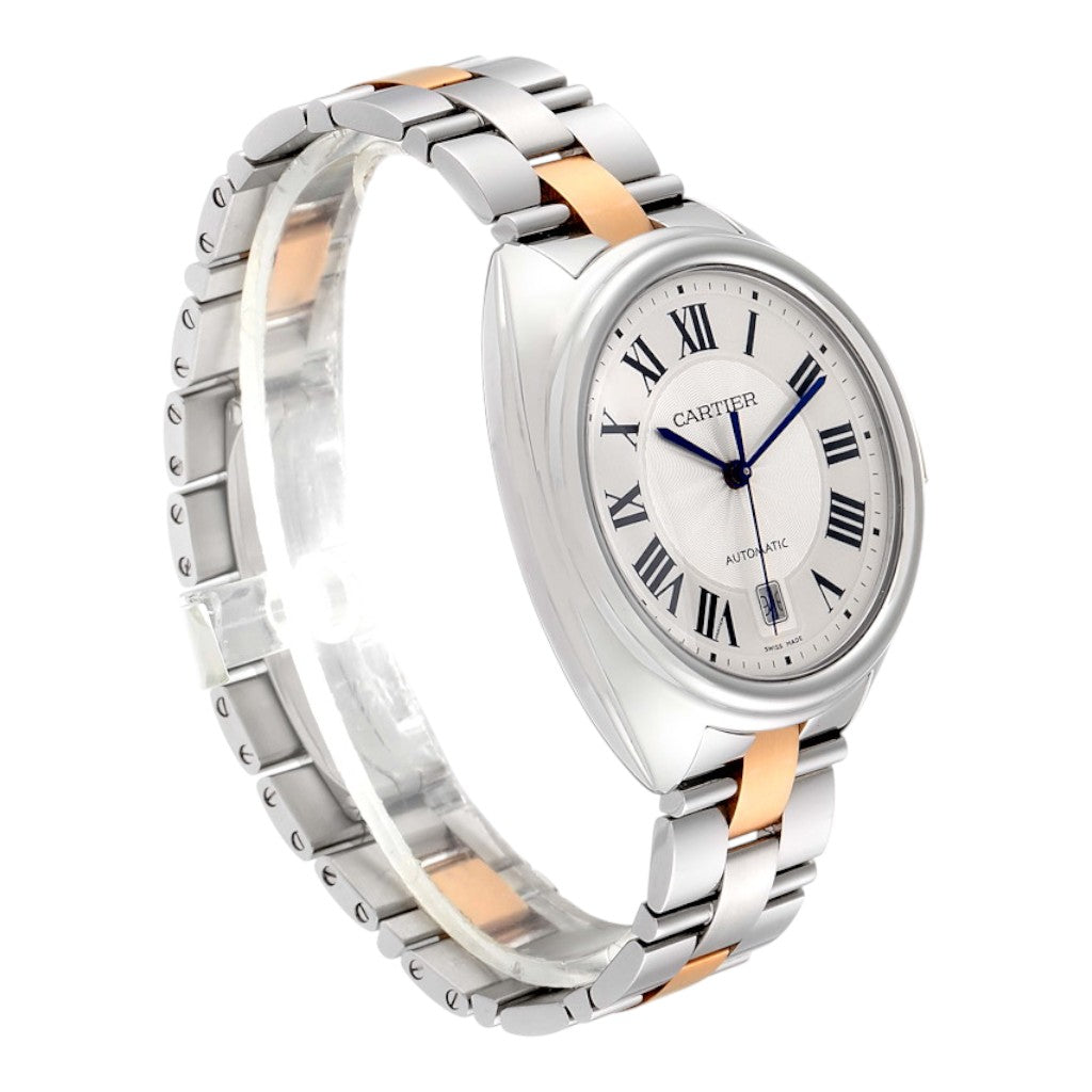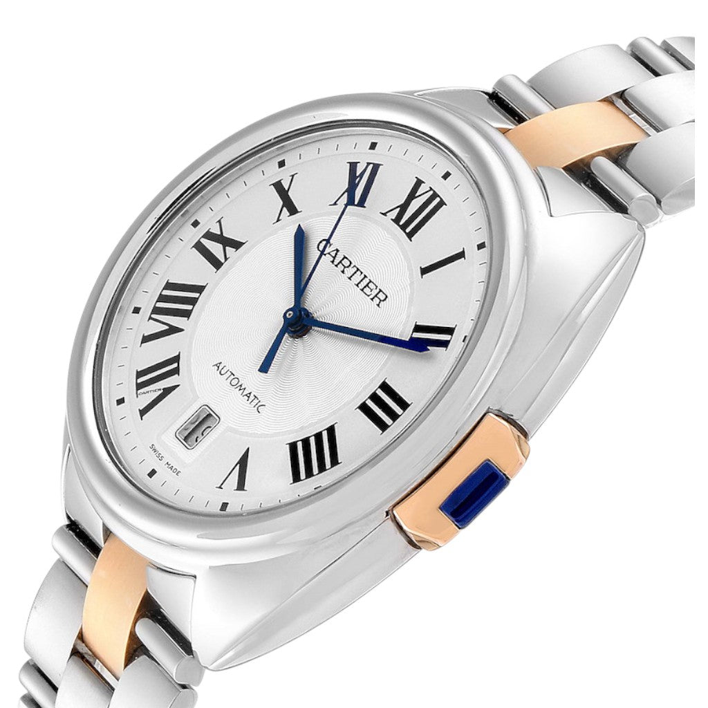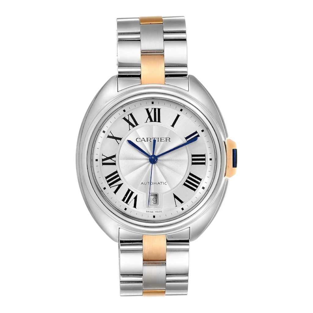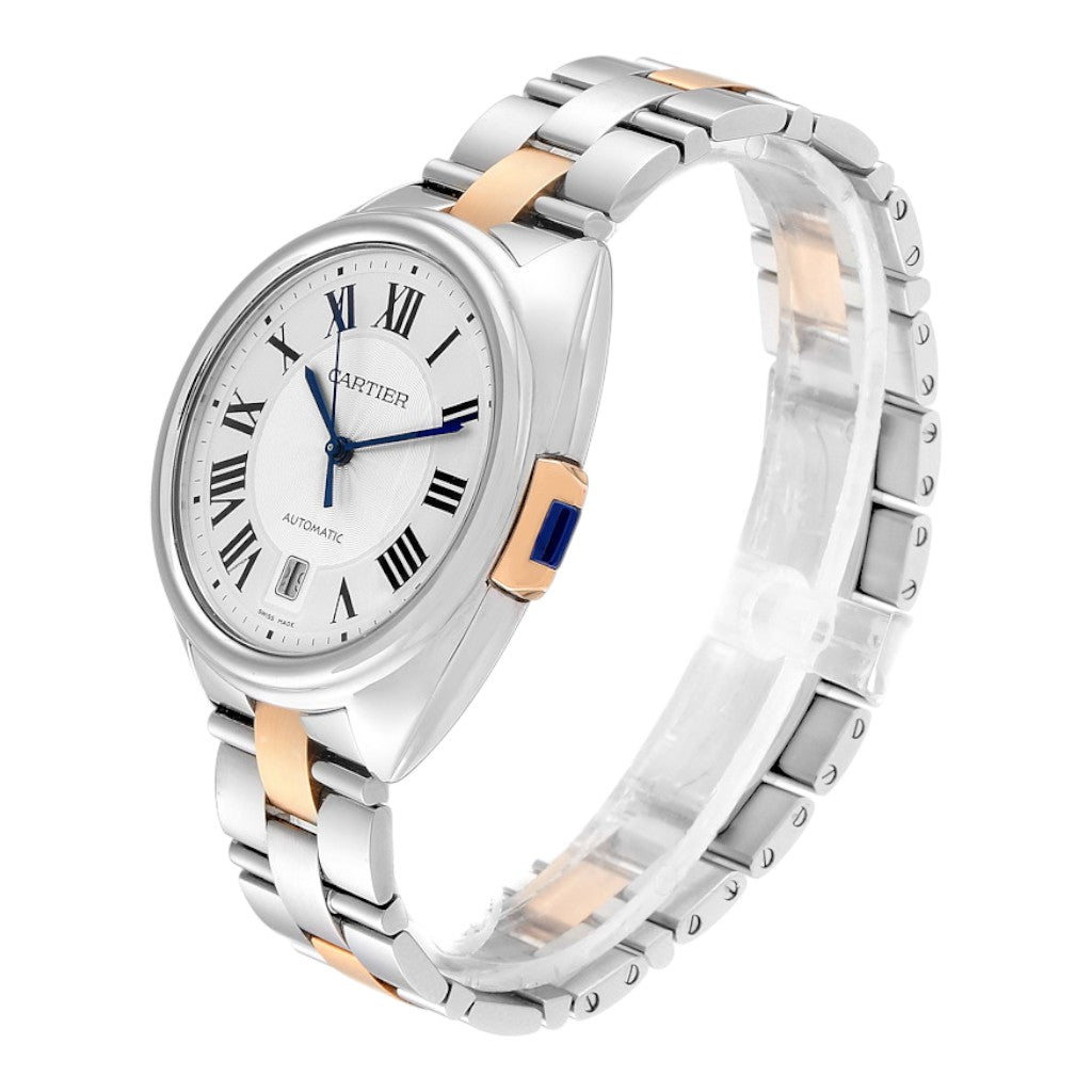 Housed in a 40 mm case crafted from stainless steel and 18k rose gold, the Clé de Cartier offers a perfectly balanced presence on the wrist. Its softly rounded case profile is complemented by the signature “Clé” crown, inspired by traditional winding keys, which gives the collection its name and unmistakable identity. The crown is set with Cartier’s iconic sapphire cabochon.