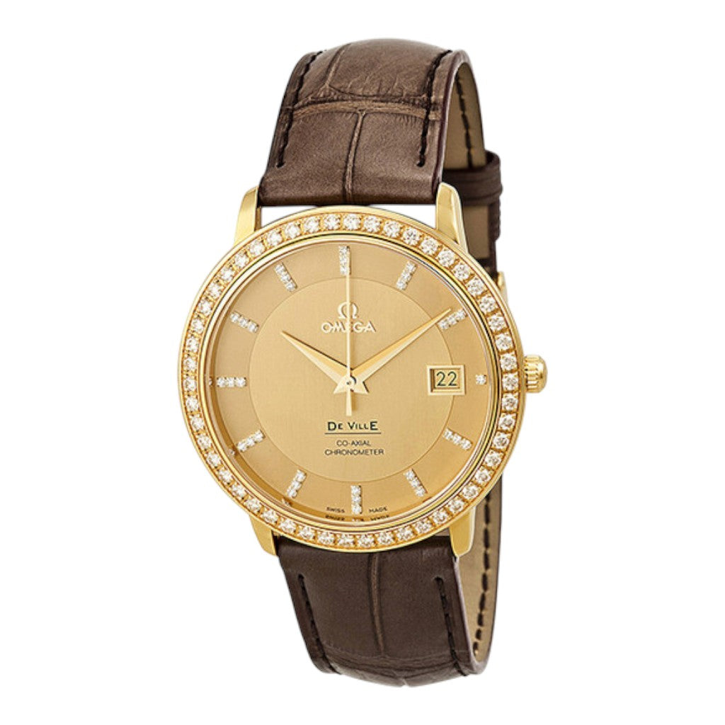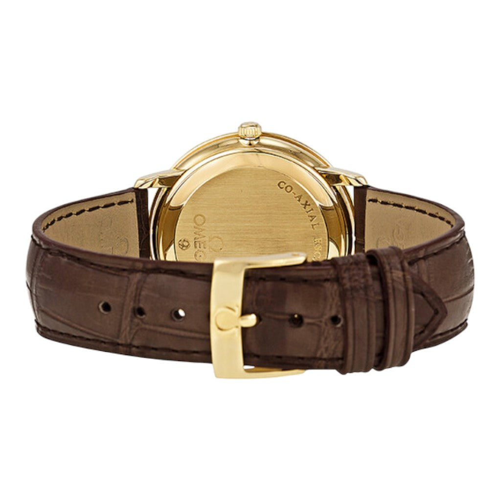 Crafted in 18k yellow gold, the 36.5 mm case offers balanced proportions and a timeless presence on the wrist. Its slim profile and polished finish reflect the understated sophistication that defines the De Ville Prestige collection. The watch is paired with a brown alligator leather strap, secured by an 18k yellow gold deployant clasp, adding warmth and refinement to the overall aesthetic.