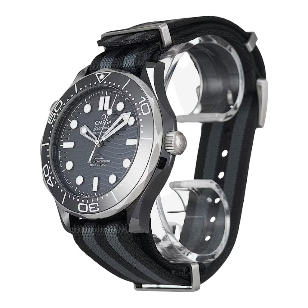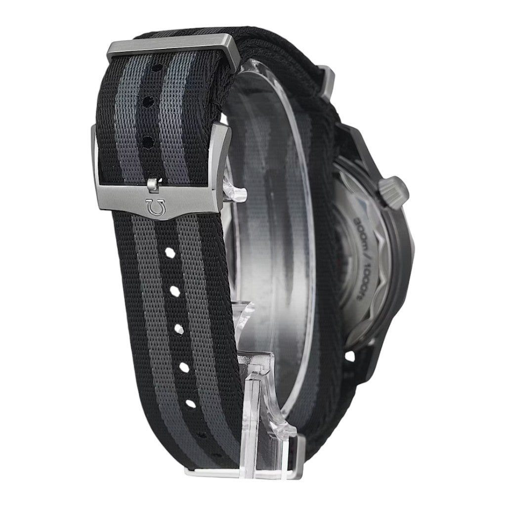 The watch features a robust 44 mm case crafted from grade 2 titanium, offering exceptional strength while remaining lightweight and comfortable on the wrist. It is paired with a black ceramic unidirectional rotating bezel with laser-engraved diving scale, ensuring durability and resistance to scratches. True to the Seamaster legacy, the watch offers 300 metres of water resistance, making it suitable for serious diving activities.