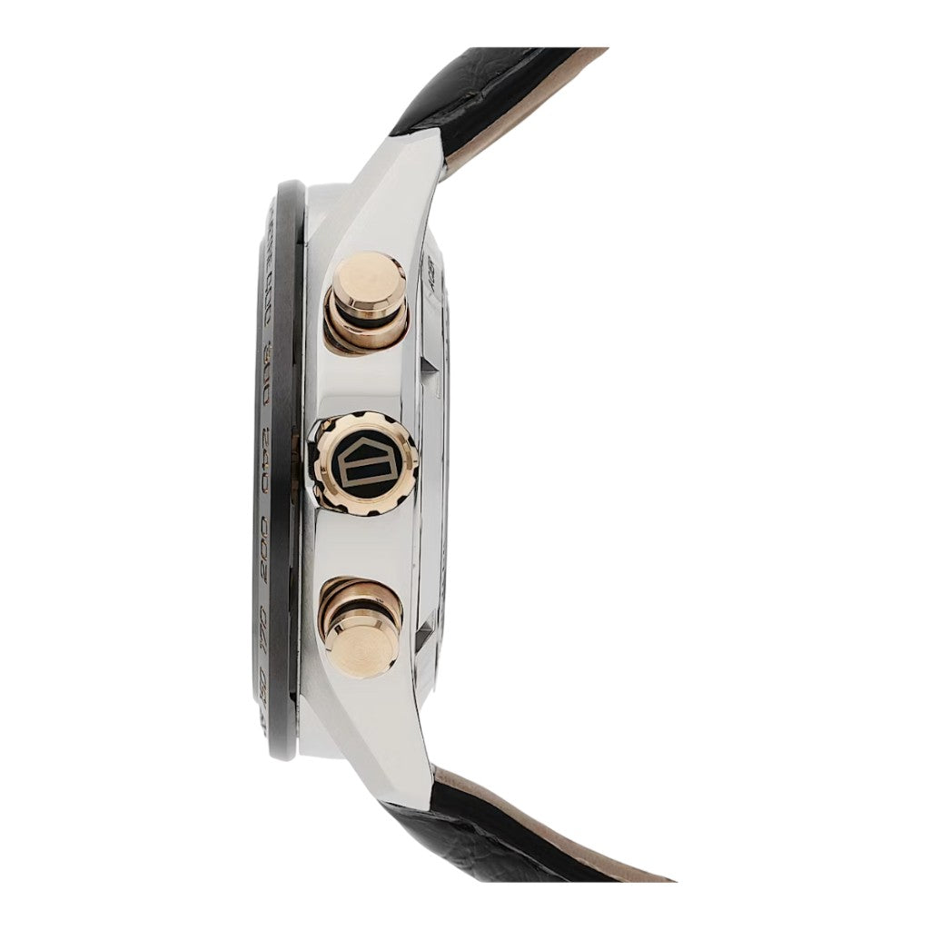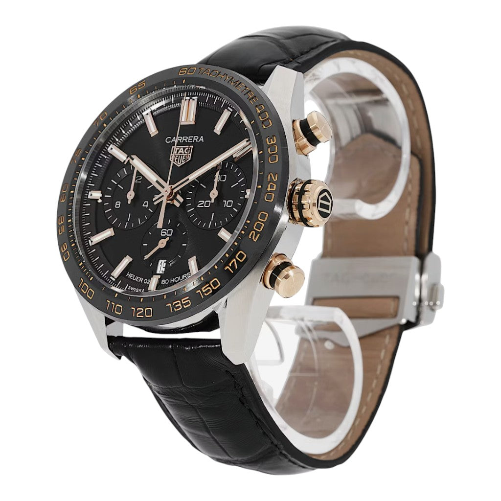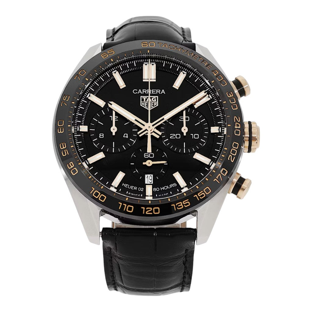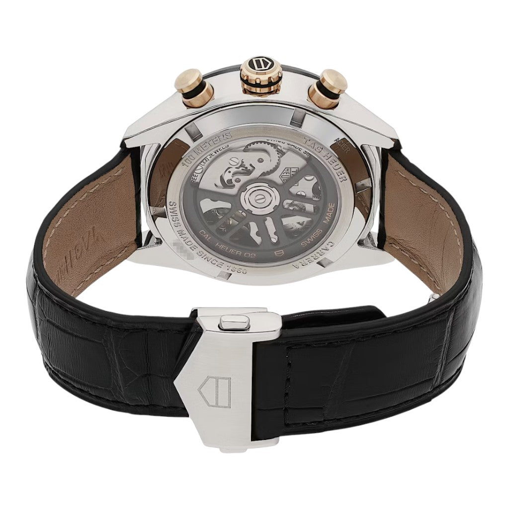 The watch is housed in a bold 44 mm stainless steel case, delivering a confident and athletic wrist presence. It is complemented by a blue ceramic tachymeter bezel, offering excellent scratch resistance while reinforcing the model’s sporty identity. The clean, angular case lines remain true to the Carrera DNA, designed for precision timing and everyday versatility.