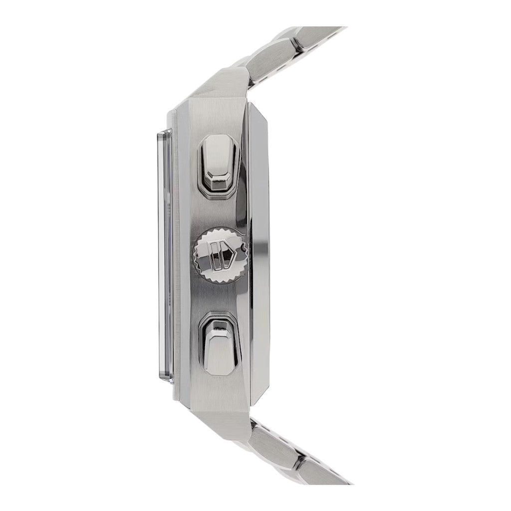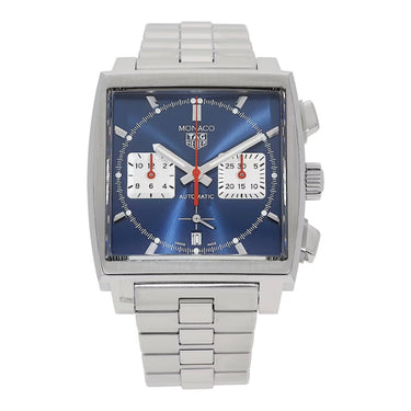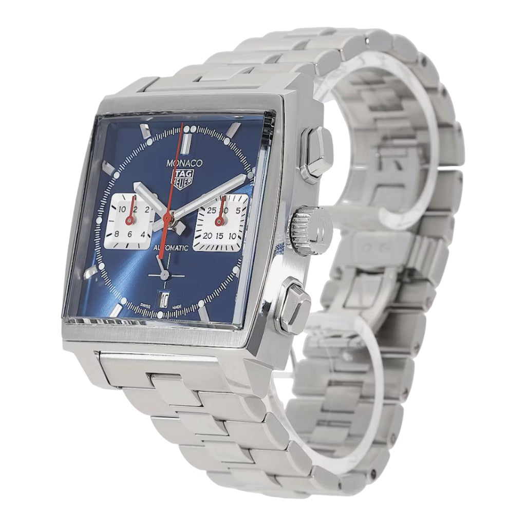 The watch features the emblematic 39 mm square stainless steel case, faithful to the original Monaco proportions while offering contemporary finishing and presence. The polished and brushed surfaces enhance the architectural lines of the case, while the sapphire crystal provides durability and clarity. Its distinctive crown placement and chronograph pushers further reinforce the Monaco’s unmistakable identity.