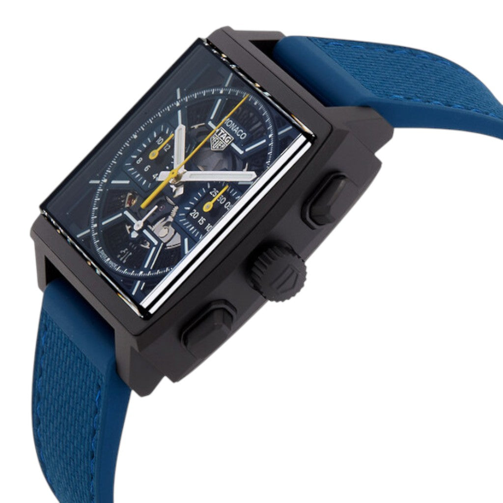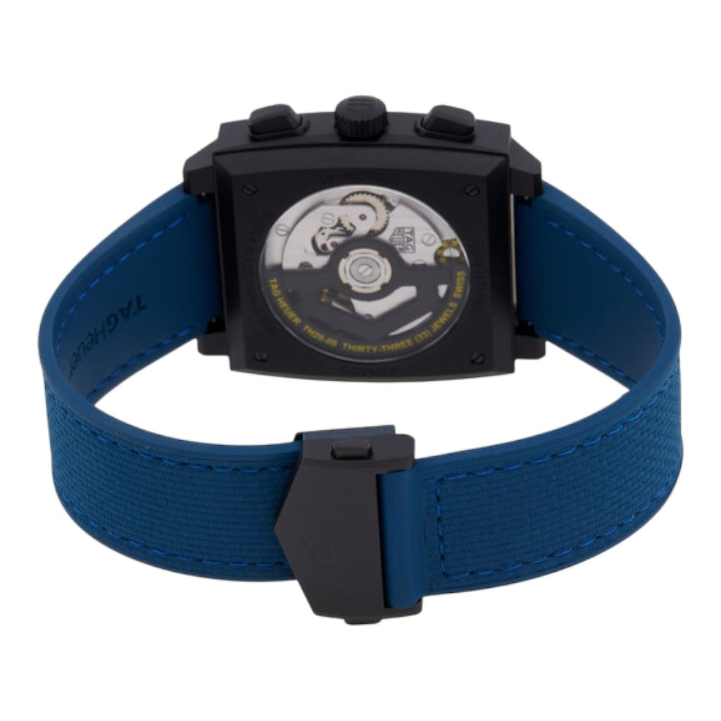 At its core, this Monaco is powered by the TAG Heuer in-house Calibre TH20-00 automatic movement, a high-performance chronograph calibre featuring a column wheel and vertical clutch, an 80-hour power reserve, and precise timekeeping at 28,800 vph. The movement is visible through a sapphire crystal caseback, showcasing its refined finishing.
