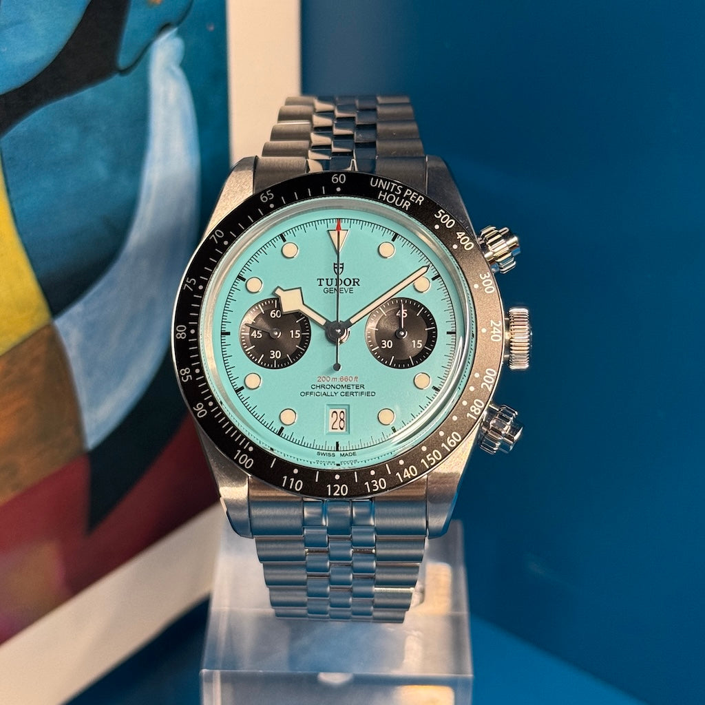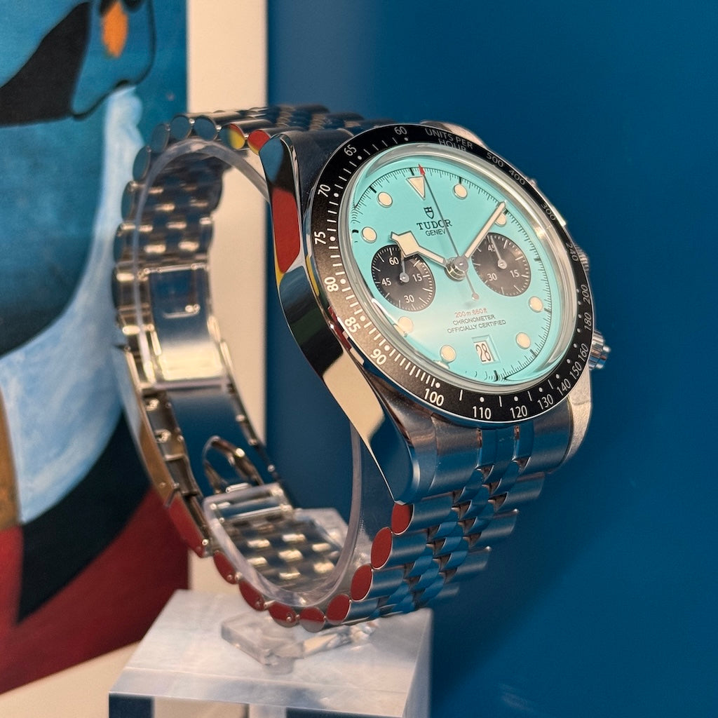 Launched in 2024, the Tudor Black Bay Chrono “Flamingo” (ref. M79360N-0024) is the bold new iteration of the brand's chronograph. Its intense blue dial, nicknamed “Flamingo Blue,” evokes tropical lagoons and lends this sporty model a vibrant and contemporary personality. Offered here in near-mint condition, this watch comes as a full set, with all its original components, and is available in Geneva.