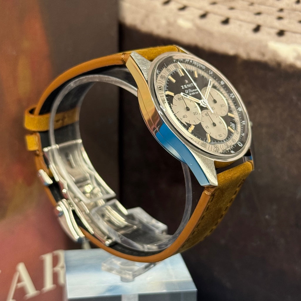 The watch is fitted with a black perforated calfskin leather strap with a Zenith-signed steel folding clasp, in perfect condition.