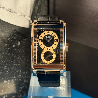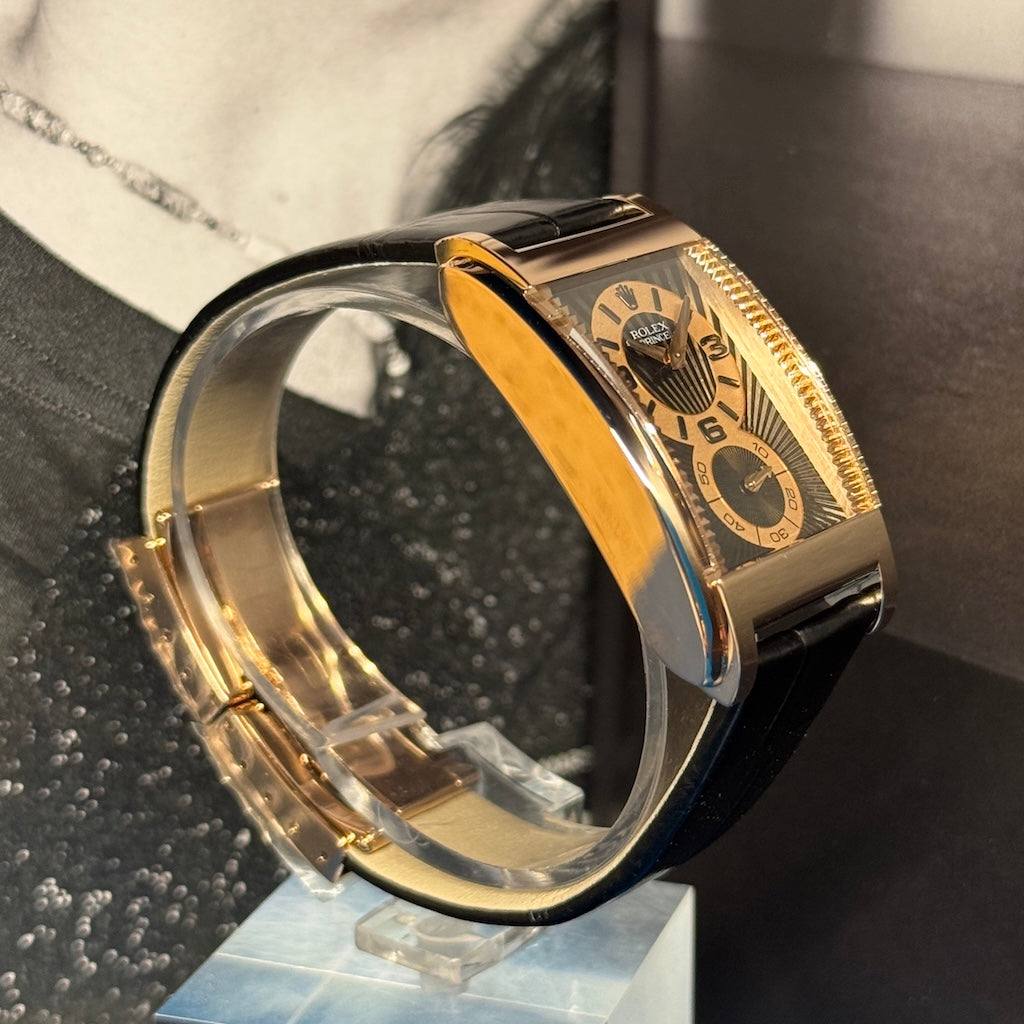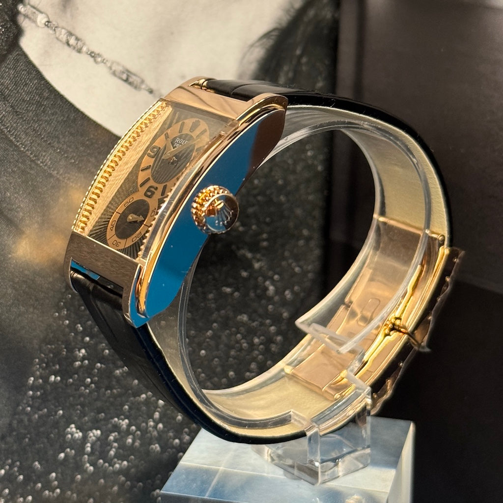 Rare, audacieuse et résolument distinguée, la Rolex Cellini Prince réf. 5442 est une montre qui s’adresse aux amateurs de design horloger classique revisité. Avec son boîtier rectangulaire en or gris 18 ct et son mouvement manuel apparent, cette pièce s’inscrit à part dans l’univers Rolex — loin des modèles sport iconiques — et fait écho à l’élégance Art déco du début du XXe siècle.