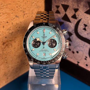 Available in Geneva, the Tudor Black Bay Chrono Flamingo Blue is a fresh and bold edition, perfect for sports watch enthusiasts who want to stand out from the crowd in style.