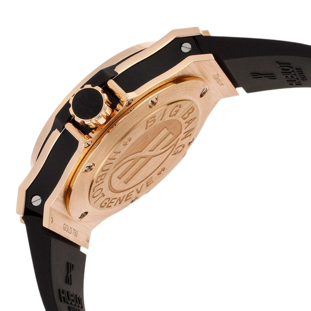 Crafted in 18k rose gold, the 38 mm case showcases Hublot’s signature layered construction, combining strong architectural lines with refined finishing. This reference is characterised by its pavé-set bezel, adorned with brilliant-cut diamonds that provide exceptional sparkle while preserving the sporty DNA of the Big Bang collection. The case is paired with a black structured rubber strap, secured by a rose gold deployant clasp, offering both comfort and durability.