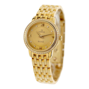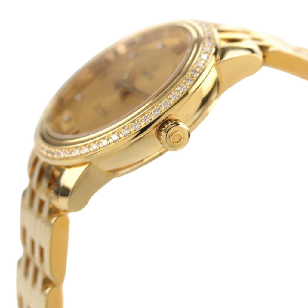 The elegant champagne-coloured dial offers a warm, refined aesthetic, perfectly complementing the yellow gold case. It is enhanced with diamond-set hour markers, adding a subtle touch of brilliance while maintaining a clean and balanced layout. Gold-toned hands and the applied Omega logo complete the dial with understated sophistication.