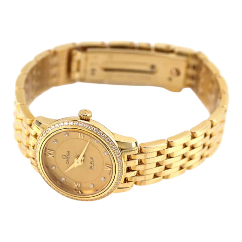 The watch features a 24.4 mm case in 18k yellow gold, delivering a delicate yet unmistakably luxurious presence on the wrist. Its slim profile and polished finish highlight the timeless design codes of the De Ville Prestige collection. The watch is fitted with a matching 18k yellow gold bracelet, seamlessly integrated for comfort and visual harmony.