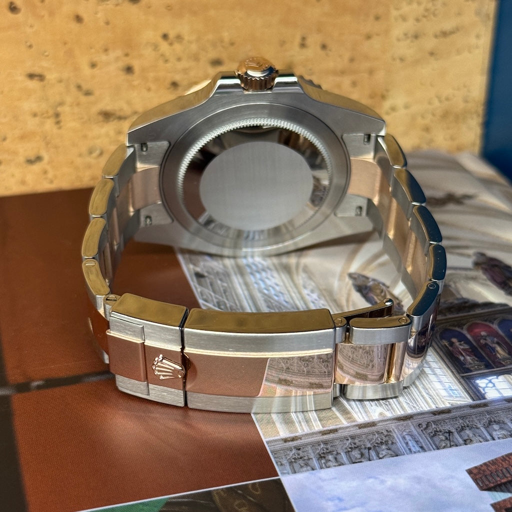 Das 40-mm-Gehäuse aus Oystersteel mit der schwarz-braunen Cerachrom-Lünette aus Hightech-Keramik harmoniert perfekt mit dem Oyster-Armband aus Stahl und 18 Karat Roségold und schafft einen eleganten und markanten Kontrast. Die beidseitig drehbare Lünette mit 24-Stunden-Graduierung ermöglicht die Anzeige einer zweiten Zeitzone über den GMT-Zeiger aus Roségold.