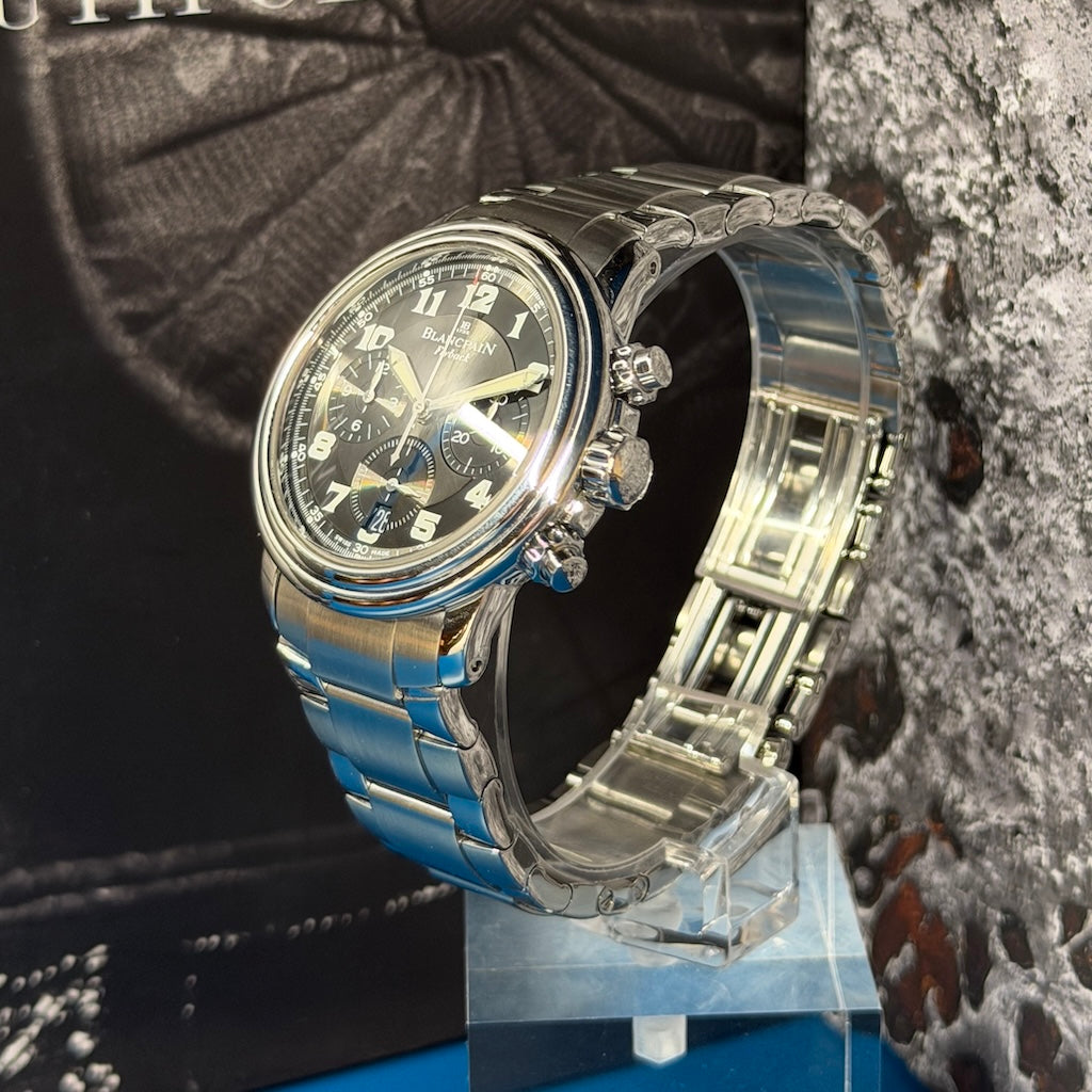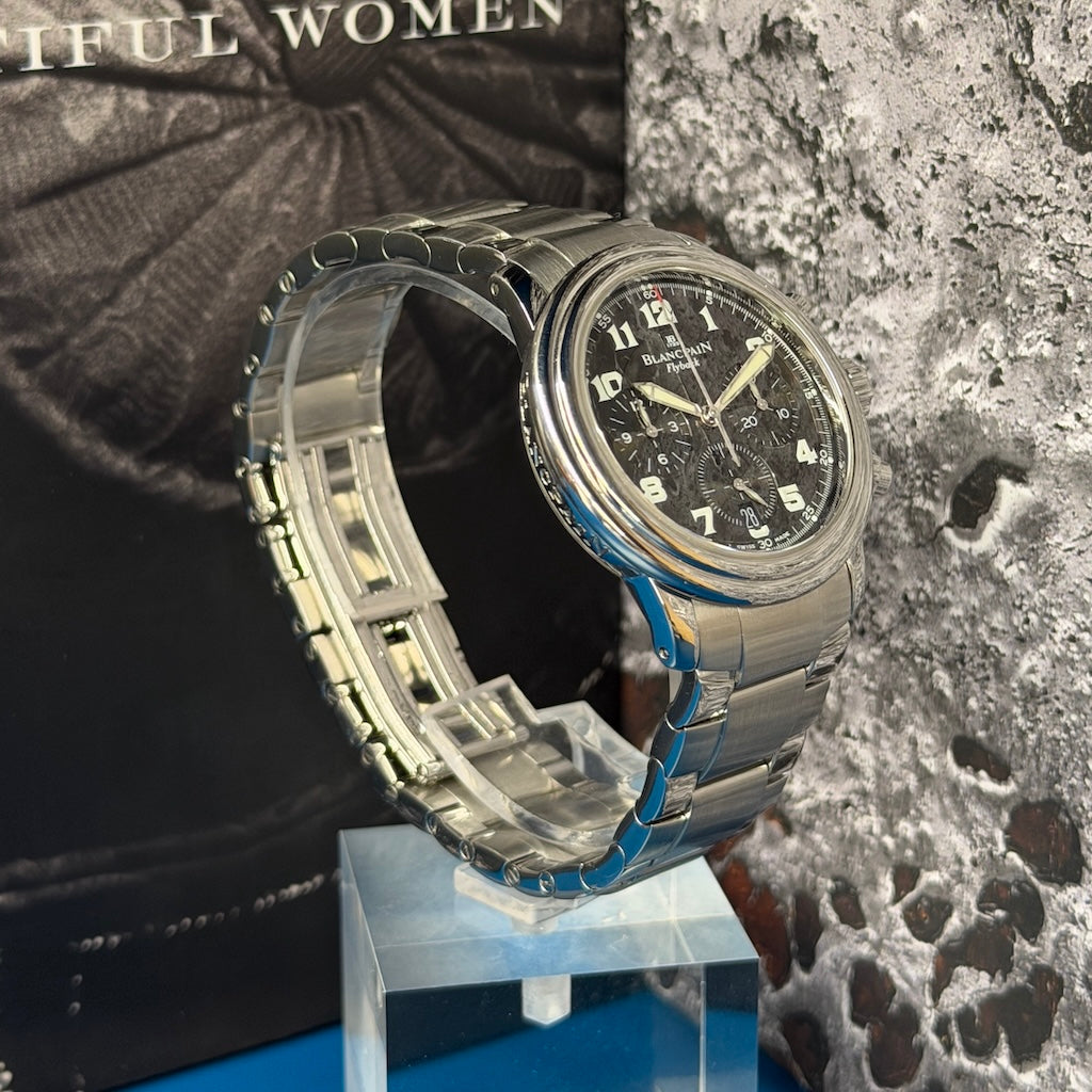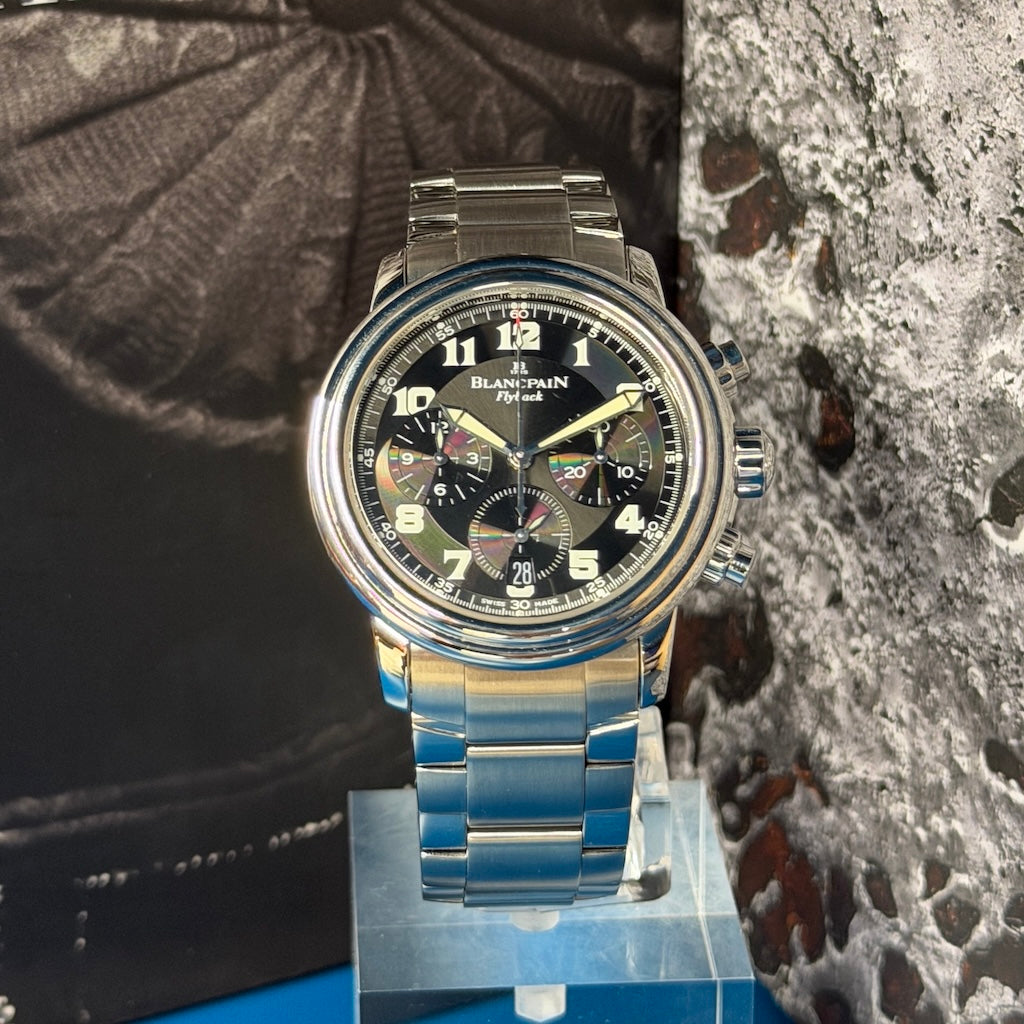 This Blancpain Léman Fly-Back 2185F-1130-71 is mounted on its original stainless steel bracelet, providing a cohesive and robust aesthetic.