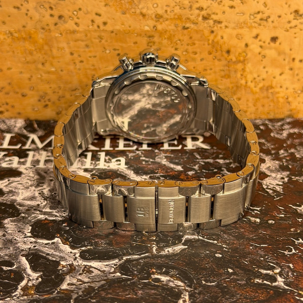 The deep black dial is clean and legible, with applied Arabic numerals, luminous hands, and well-positioned chronograph sub-dials. A date window is subtly integrated between 4 and 5 o’clock. The red-tipped chronograph hand and flyback function allow for quick and seamless timing resets — a hallmark of professional-grade chronographs.