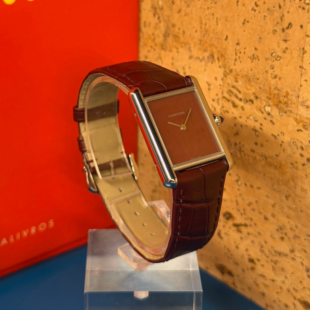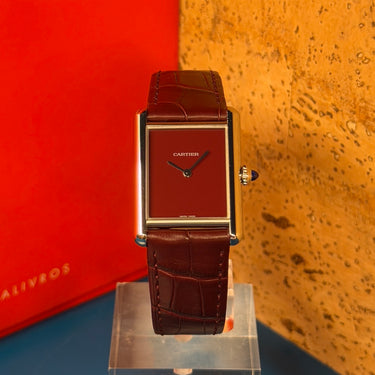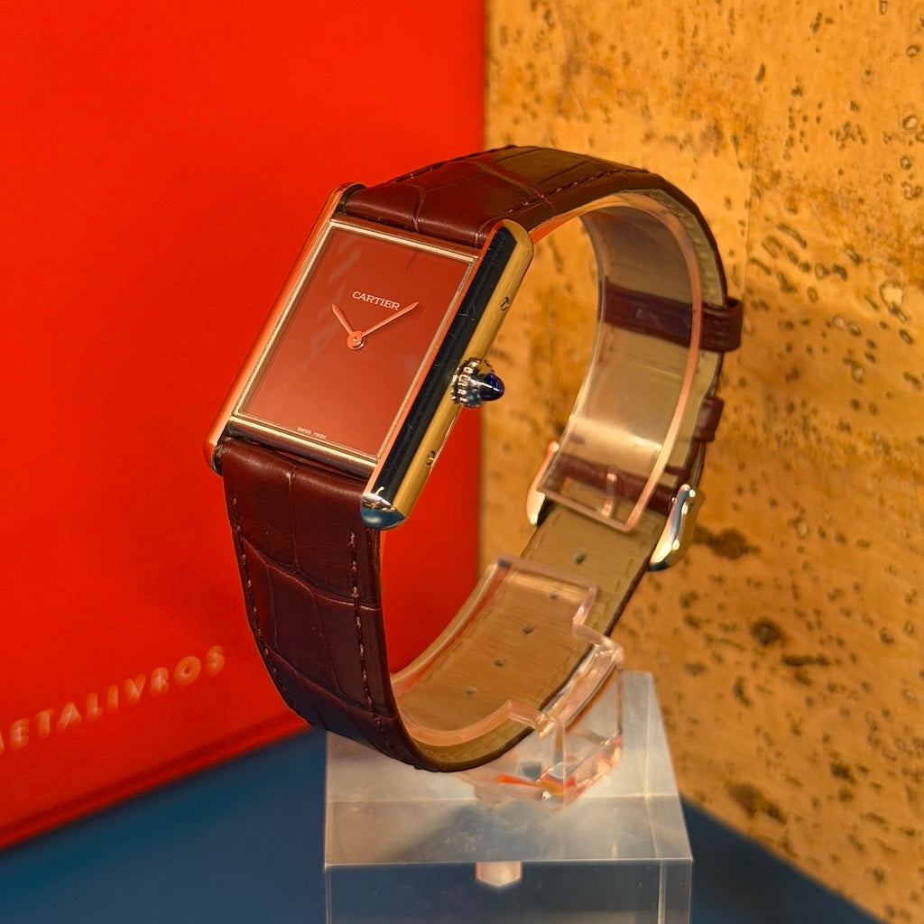 The deep burgundy lacquered dial is rich, confident, and beautifully finished, paired with Cartier's iconic blued-steel sword hands for a colour contrast that is as refined as it is striking. This is not a watch that blends in, and it knows it.