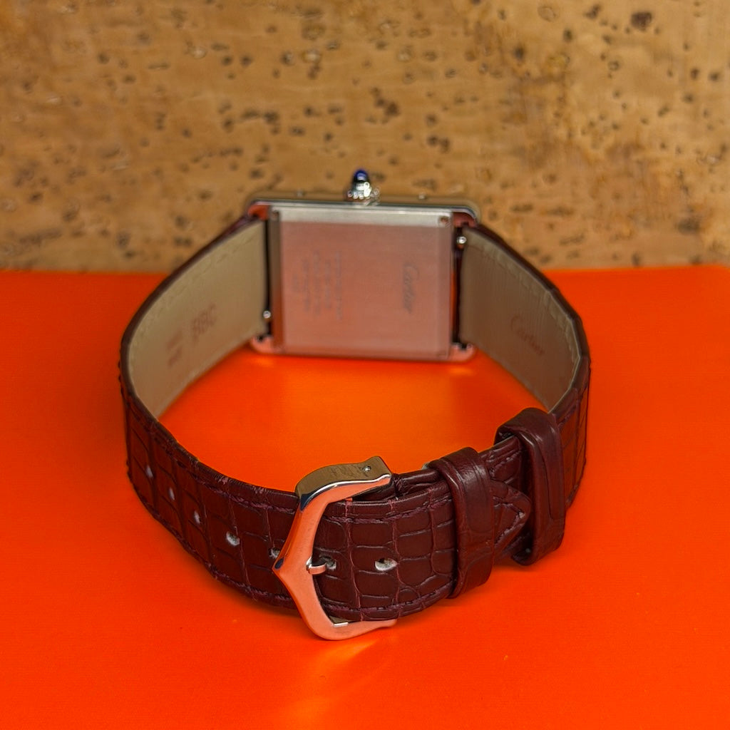 Delivered with its original burgundy alligator strap and an additional black calf leather strap, this Tank Must is ready to adapt to any wardrobe without a second thought.