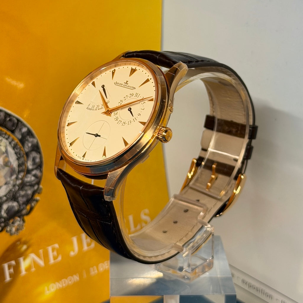 The Jaeger-LeCoultre Master Ultra Thin Power Reserve, reference Q1372520, represents the pinnacle of understated sophistication in fine Swiss watchmaking. This certified pre-owned 2025 example is presented in excellent condition and comes as a full set, including original box, warranty papers, and accessories — a collector-worthy timepiece with pristine presentation.