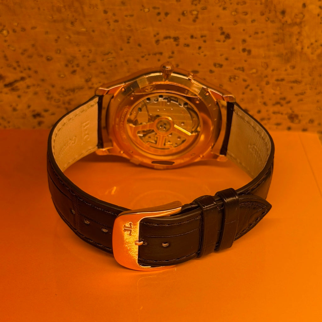 Housed in a refined 39 mm case crafted from 18k rose gold, this model exudes timeless elegance with a slim profile that fits effortlessly under a cuff. The minimalist case design is complemented by sharp lugs, polished surfaces, and a discreet crown, highlighting Jaeger-LeCoultre’s mastery of classic proportions and finishing.