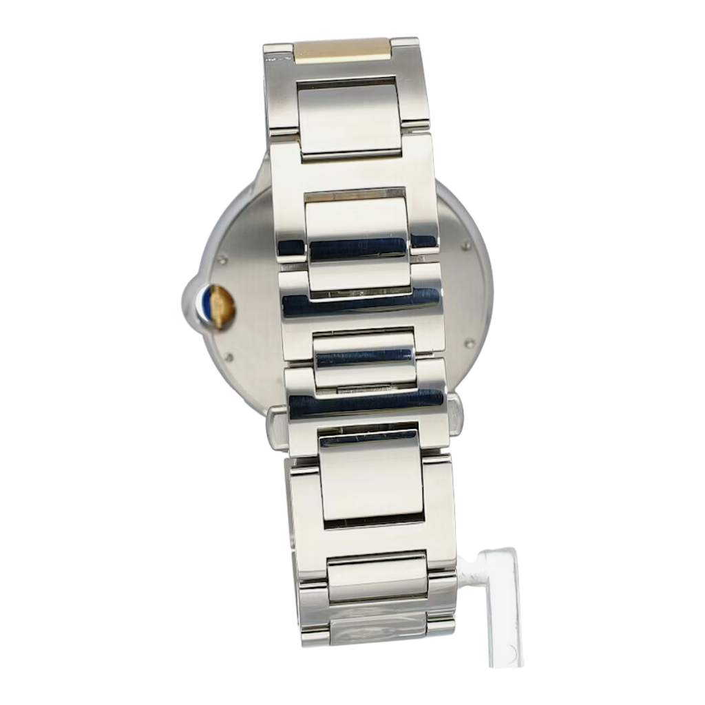 La Ballon Bleu se distingue par son boîtier arrondi en acier inoxydable, ses courbes douces et son profil bombé, offrant un confort exceptionnel au poignet. Son protège-couronne intégré, signature de la marque, entoure la couronne sertie d'un cabochon bleu, conférant à la montre son esthétique de « ballon flottant » et l'identité Cartier inimitable.