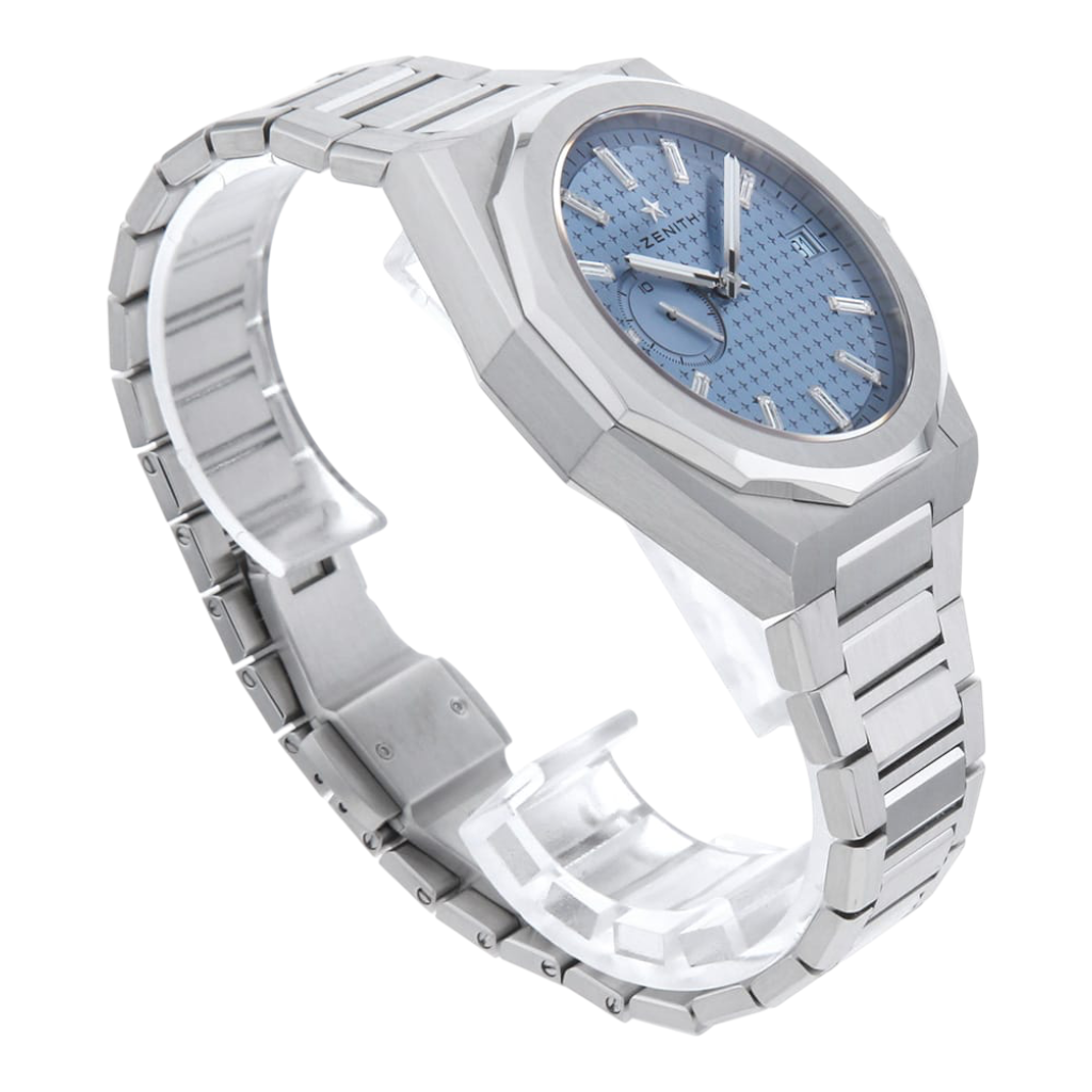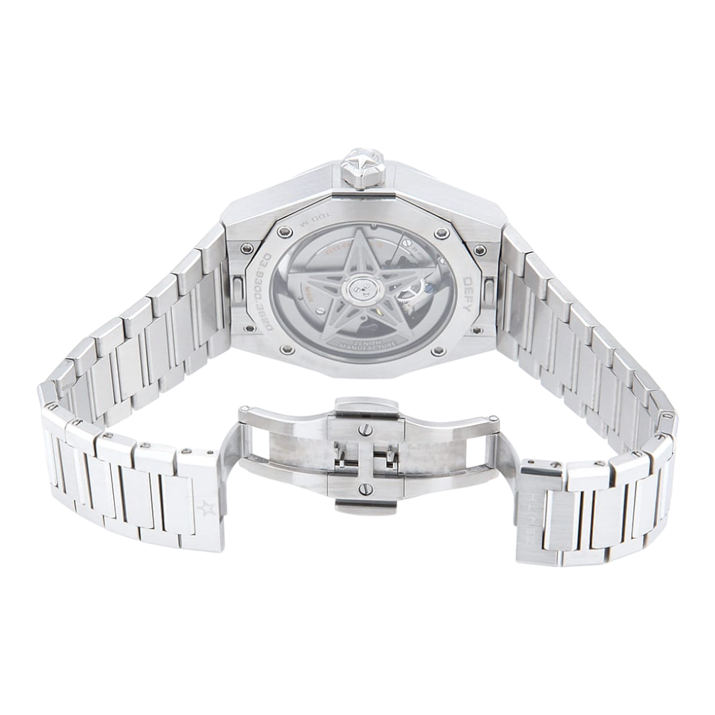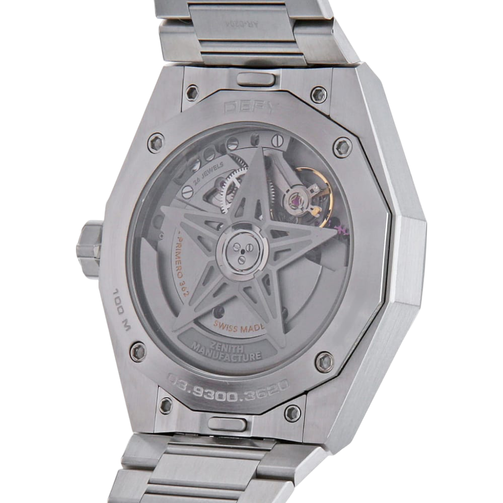 Cette montre arbore un boîtier octogonal audacieux de 41 mm en acier inoxydable, inspiré du design original de la Defy des années 1960. Sa silhouette facettée et ses surfaces brossées raffinées lui confèrent une présence à la fois imposante et élégante au poignet. Le cadran gris texturé, orné de l'étoile à quatre branches emblématique de Zenith, lui apporte une profondeur visuelle dynamique, tandis que la précision des aiguilles et des index garantit une excellente lisibilité. À 9 heures, le compteur 1/10e de seconde témoigne du savoir-faire de Zenith en matière de précision mécanique haute fréquence.