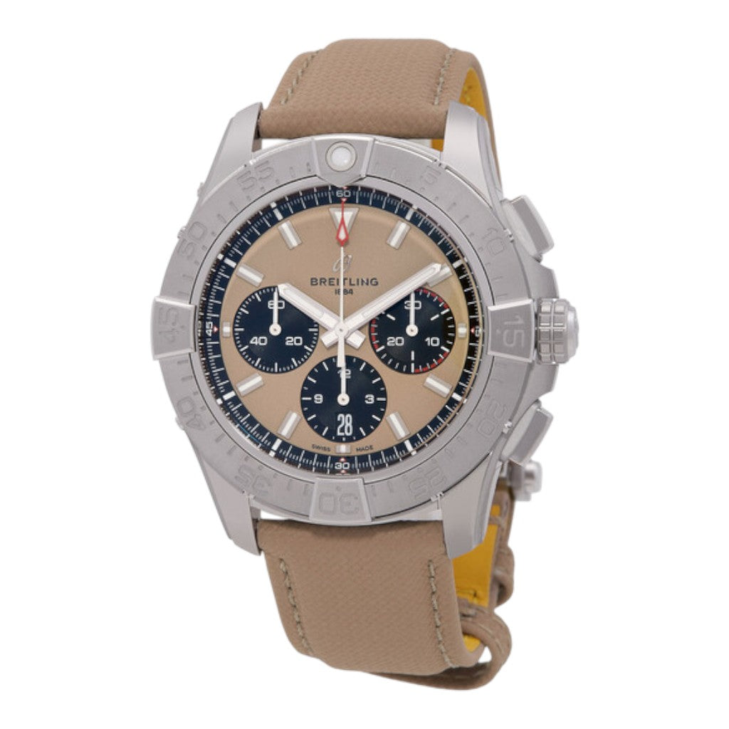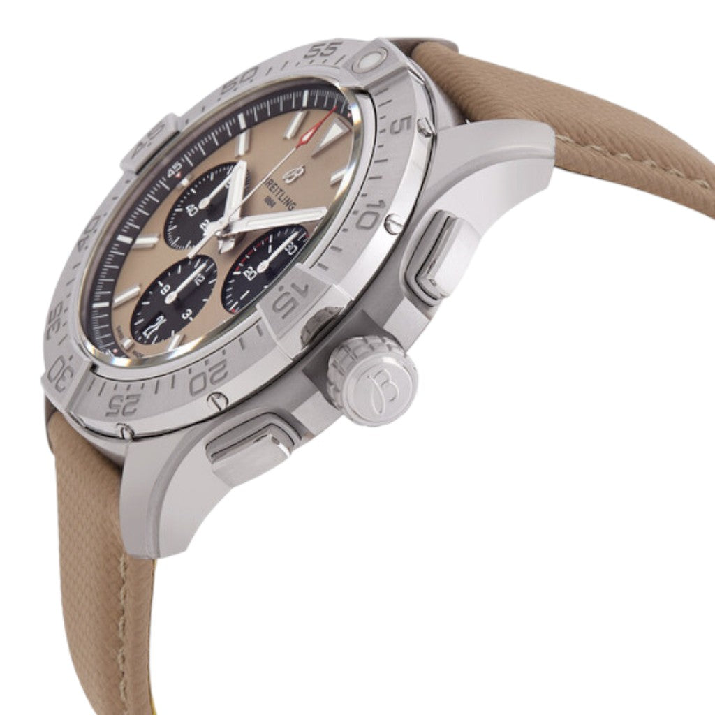 The watch features a solid 44 mm stainless steel case with a powerful wrist presence and a design rooted in professional aviation instruments. Its beige and black dial offers a distinctive and contemporary aesthetic while maintaining excellent readability. Large Arabic numerals, bold luminous hands, and contrasting chronograph counters ensure instant clarity in all environments, whether in flight or on the ground. The unidirectional bezel further enhances the tool-watch character of the Avenger collection.