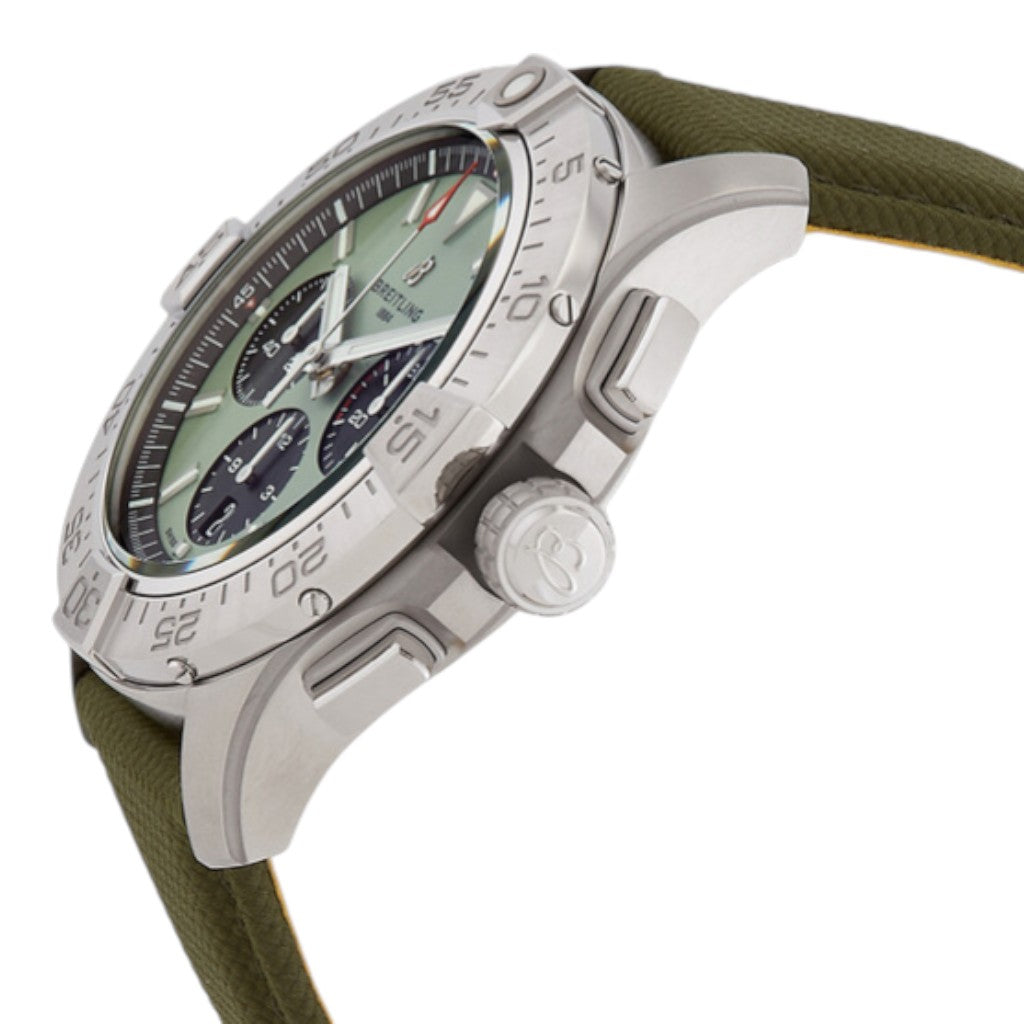 The striking green dial delivers strong visual impact, complemented by contrasting chronograph sub-dials for optimal legibility. Large applied hour markers and luminous hands ensure clarity in all conditions, while the unidirectional rotating bezel with rider tabs enhances grip and reinforces the watch’s aviation-inspired DNA. Paired with a high-quality leather strap, the stainless steel case offers a balanced combination of strength and sophistication.