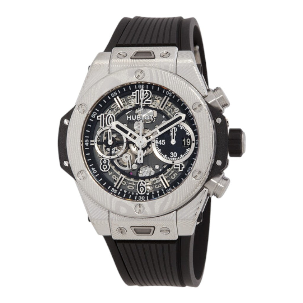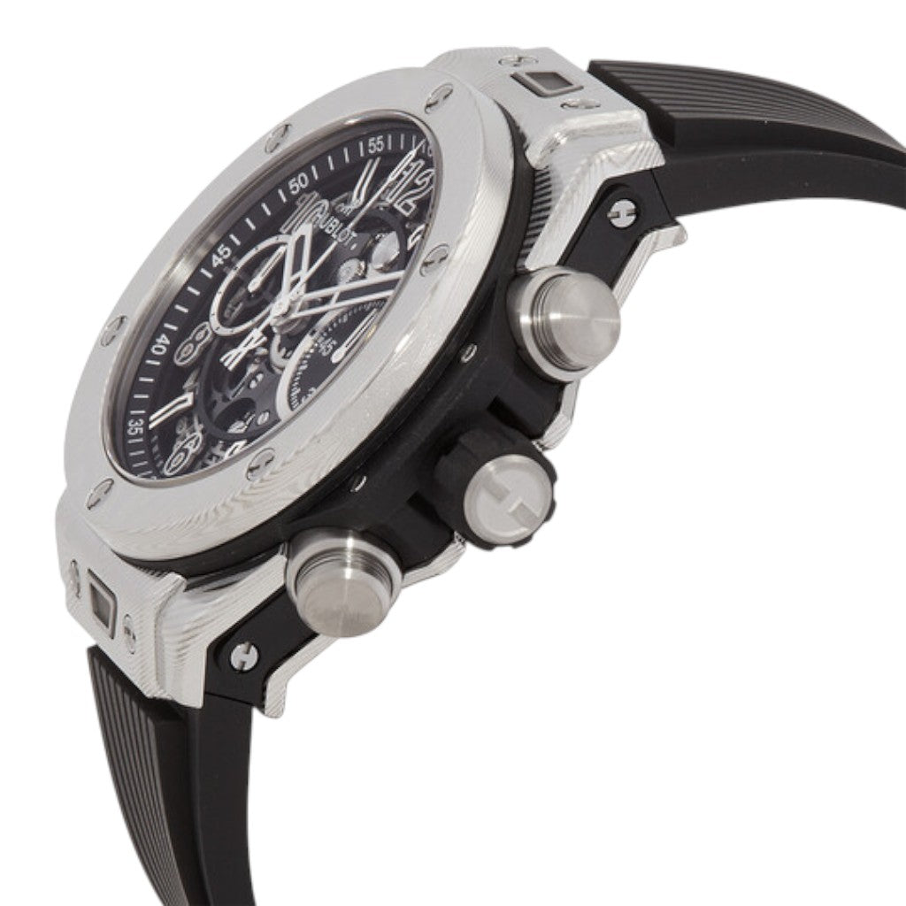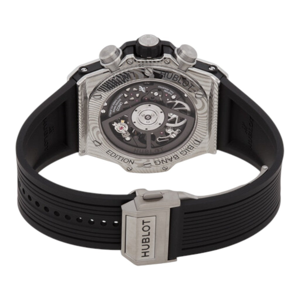 At the heart of this pre-owned luxury watch is the Hublot manufacture calibre HUB1280 Unico, an in-house automatic chronograph movement featuring a column wheel and flyback function. This modern calibre delivers a power reserve of approximately 72 hours and is entirely developed and manufactured in Switzerland, reflecting Hublot’s technical expertise.