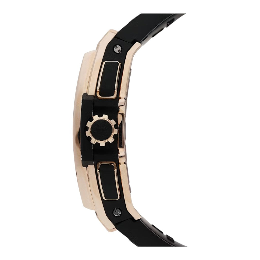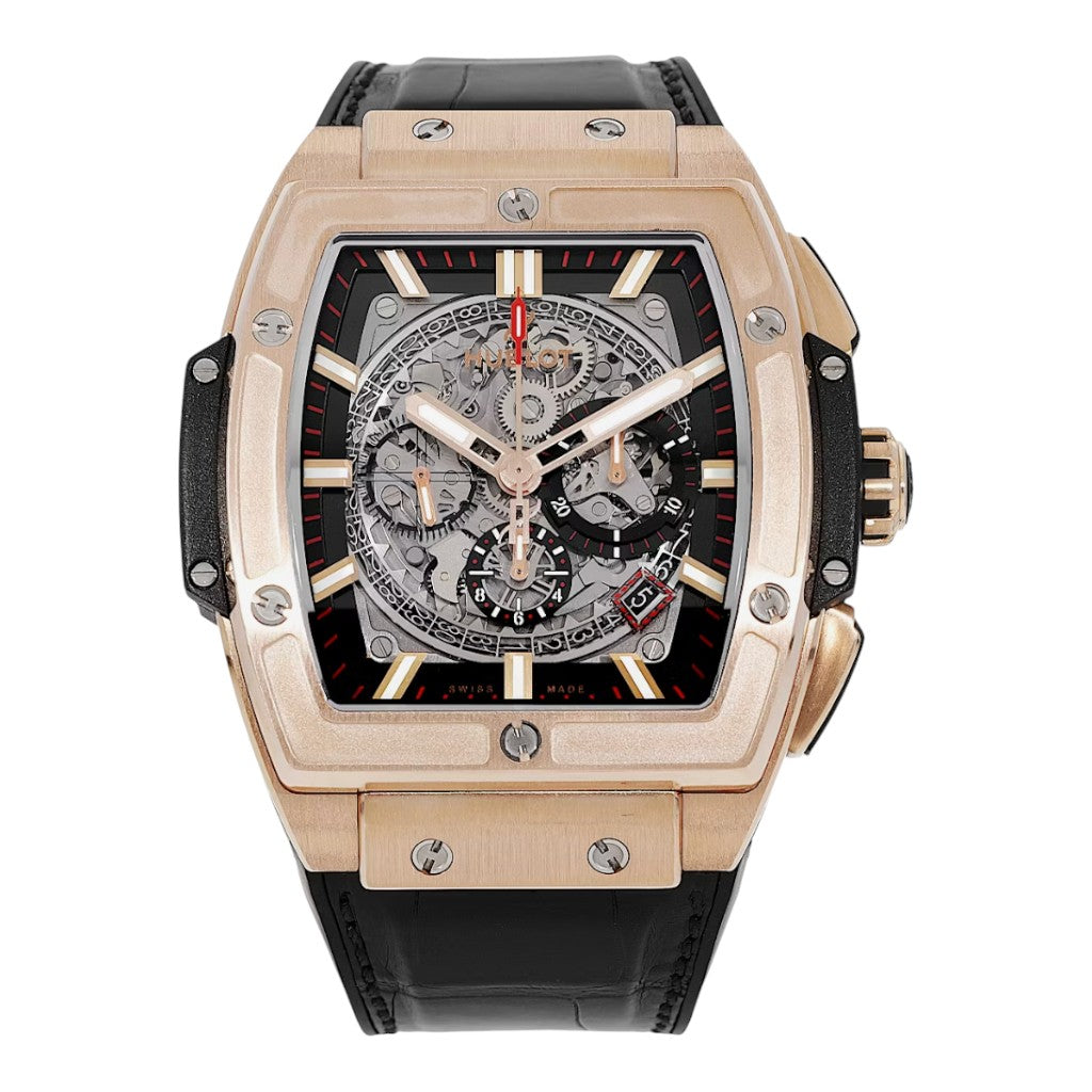 The watch is housed in a 45 mm case crafted from 18K King Gold, Hublot’s proprietary alloy enriched with platinum to enhance colour depth and resistance to fading. The polished and satin-finished case is secured with H-shaped screws on the bezel, reinforcing the collection’s unmistakable identity. The skeletonised dial reveals the chronograph architecture beneath, creating a dynamic three-dimensional display, while applied hour markers and hands with luminescent coating ensure legibility despite the openworked design. A sapphire crystal with anti-reflective treatment protects the dial.