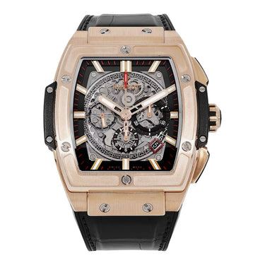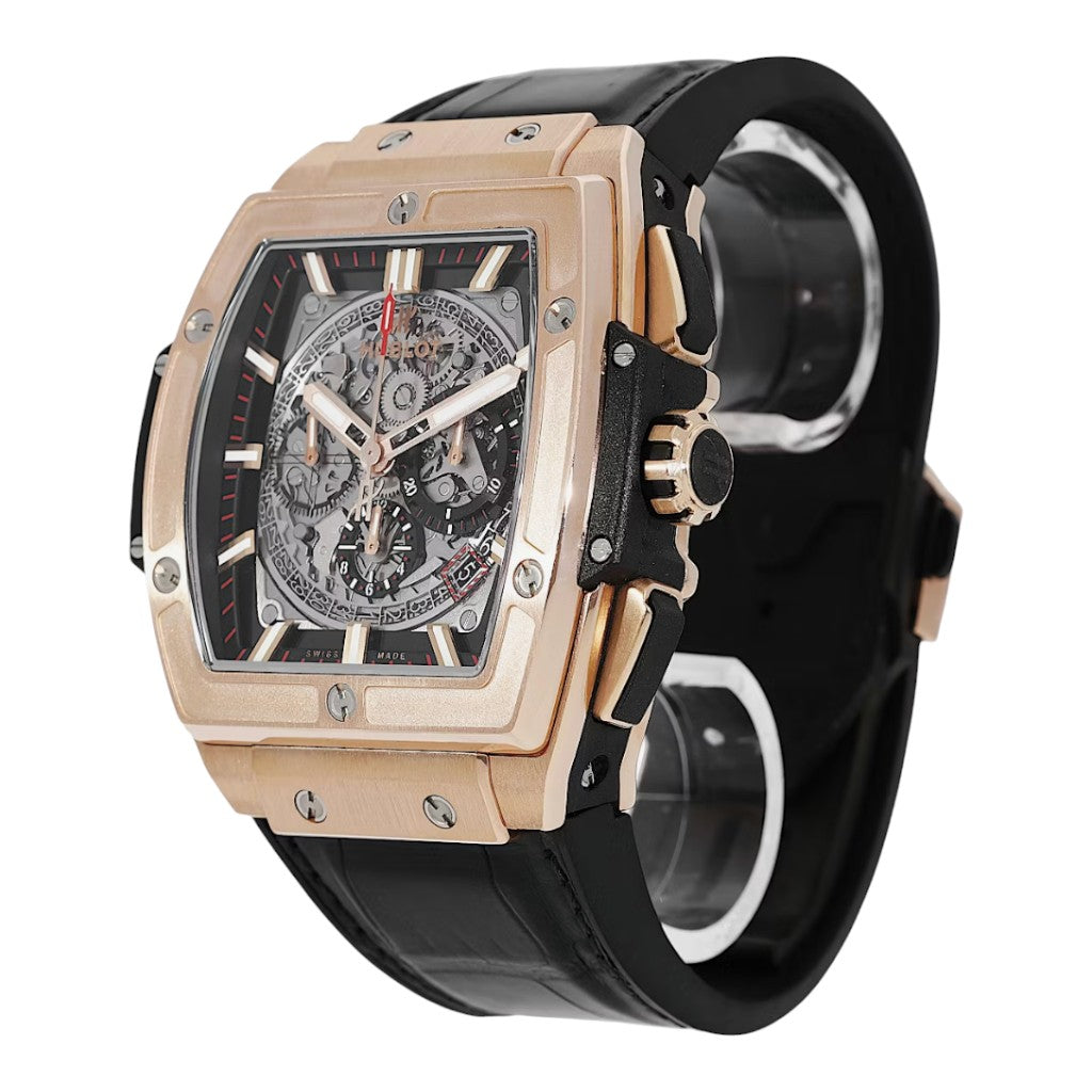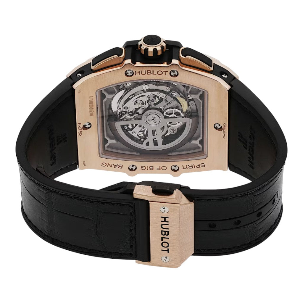 The watch is fitted with a black alligator leather strap lined with rubber, secured by an 18K King Gold deployant clasp, offering both elegance and wearing comfort. Bold, luxurious, and technically accomplished, this Hublot Spirit of Big Bang King Gold is a highly attractive pre-owned luxury watch, offered in excellent full set condition for collectors seeking a strong statement piece.
