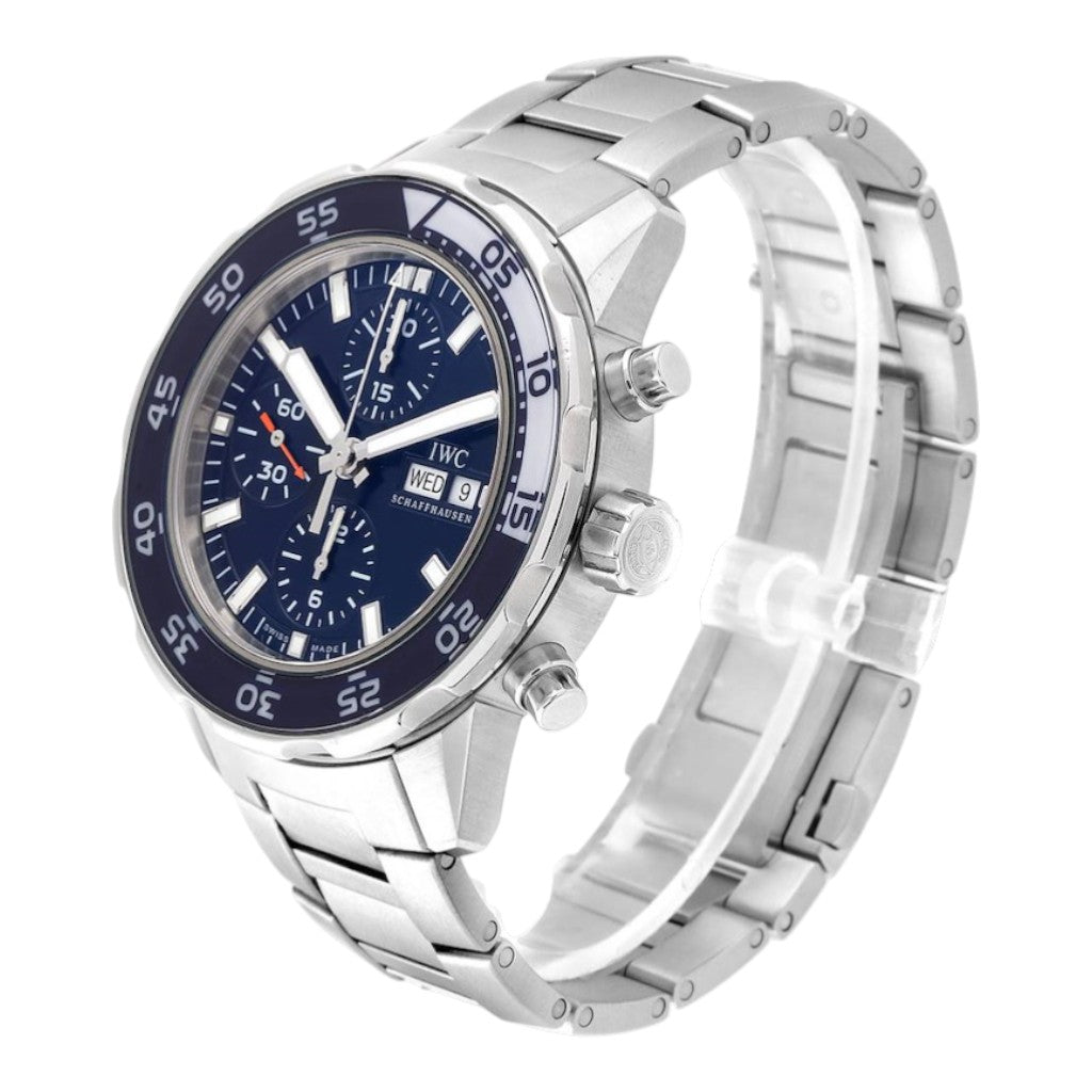 The blue dial offers excellent depth and legibility, featuring luminous hour markers and bold hands designed for optimal underwater visibility. The chronograph layout is clean and functional, with sub-dials positioned for intuitive reading, while the date and day display at 3 o’clock enhances practicality. The signature internal rotating bezel, operated via IWC’s SafeDive system, ensures precise dive timing while protecting the mechanism from accidental adjustment. The stainless steel bracelet integrates seamlessly with the case, reinforcing the watch’s cohesive and professional aesthetic.