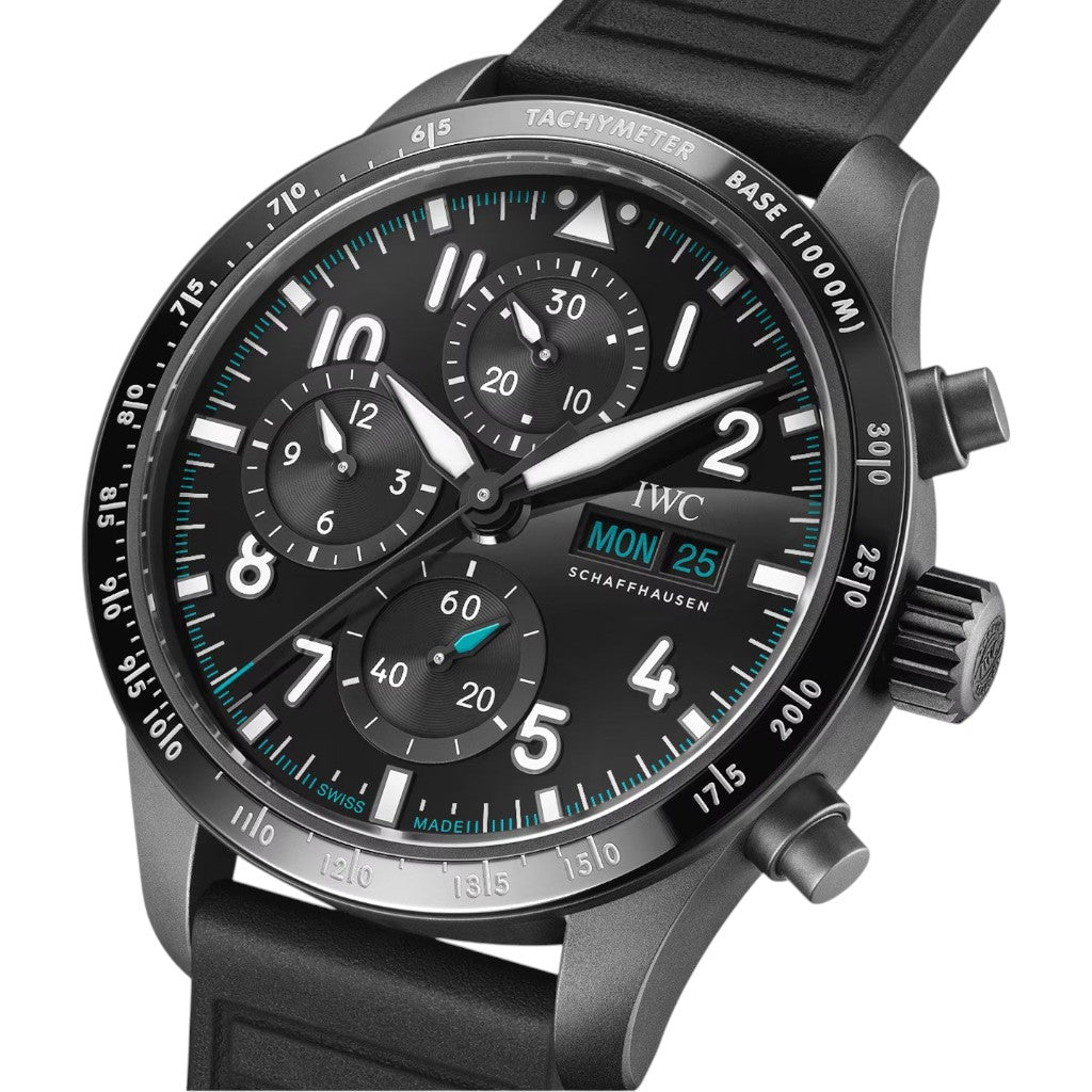 The watch features a 41 mm case crafted from Ceratanium®, IWC’s proprietary material that combines the lightweight strength of titanium with the scratch resistance of ceramic. The black dial ensures maximum legibility, enhanced by luminous Arabic numerals and hands, along with contrasting chronograph sub-dials for clear timing functionality. The tachymeter scale on the bezel reinforces its performance-oriented character and motorsport inspiration.
