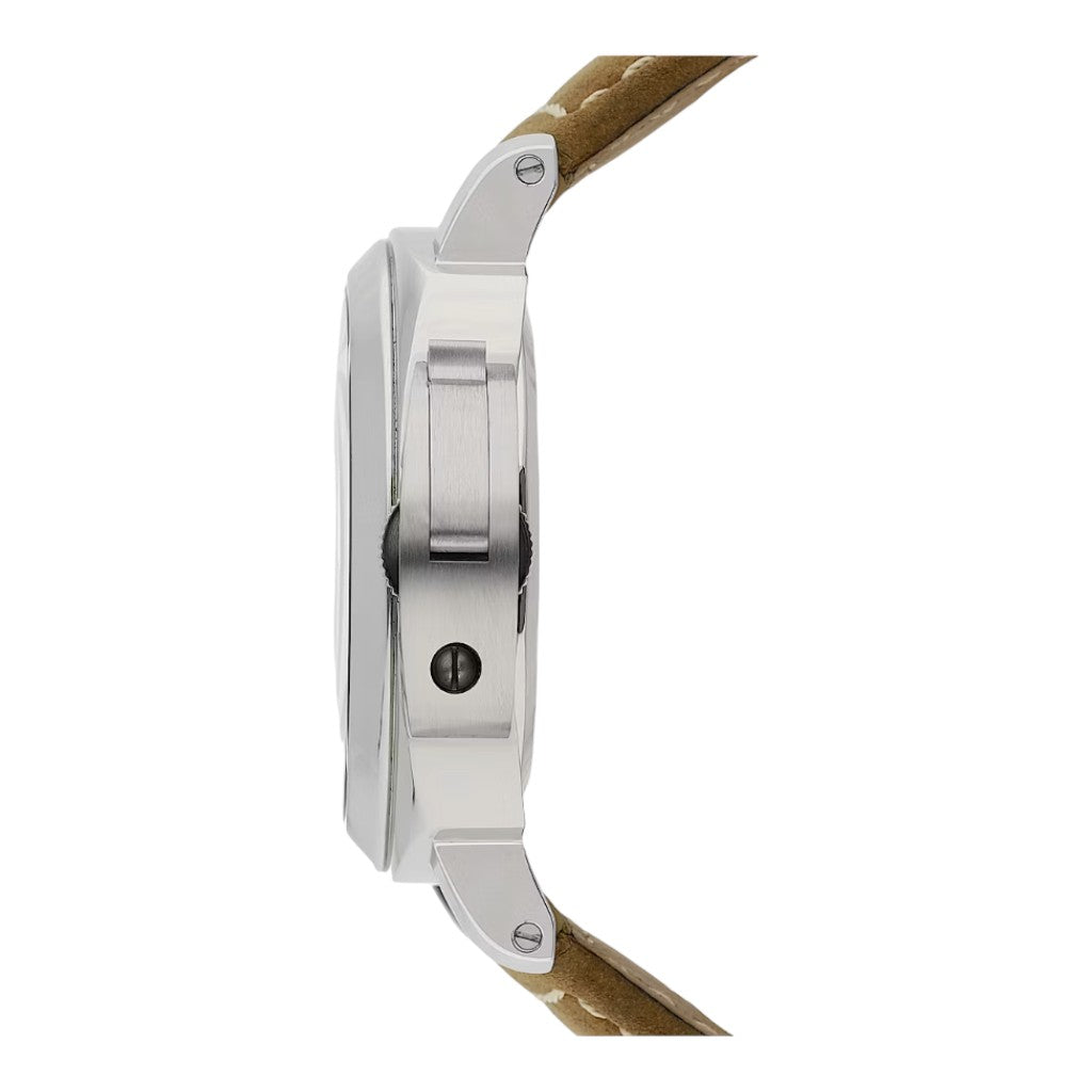 The watch features a 44 mm stainless steel case with the unmistakable Luminor crown-protecting bridge, a signature element of Panerai’s historic military heritage. The black dial offers exceptional legibility, with large luminous Arabic numerals and hour markers in a clean, time-only layout. The OP logo positioned at 6 o’clock adds a distinctive touch, referencing Panerai’s historical identity. The overall design remains faithful to the brand’s tool-watch origins, prioritising clarity and bold presence.