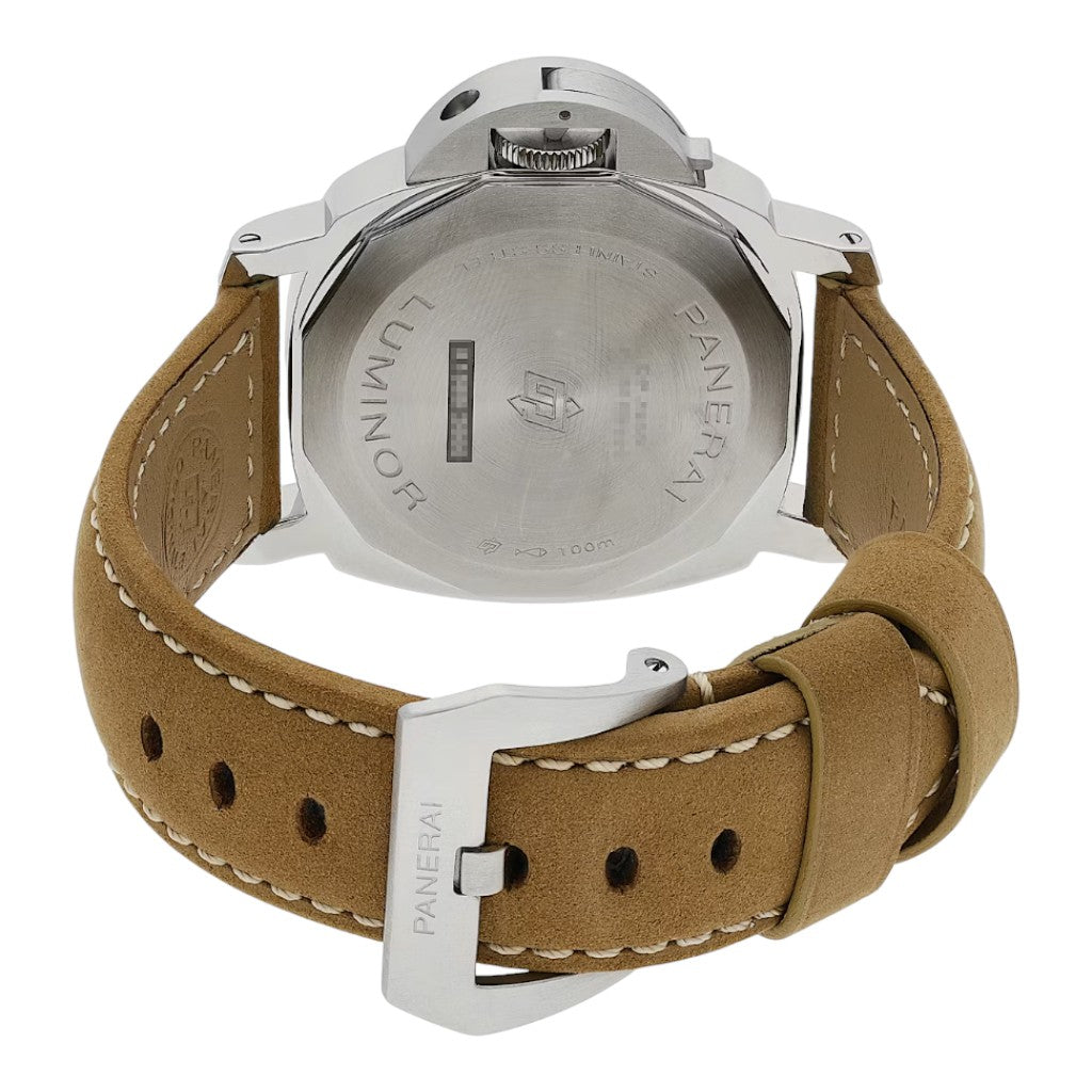 The watch is fitted with a leather strap that complements the stainless steel case and enhances its classic Luminor character. In good overall condition, the watch shows visible signs of wear consistent with regular use, including a small impact mark on the bezel, while remaining fully functional.