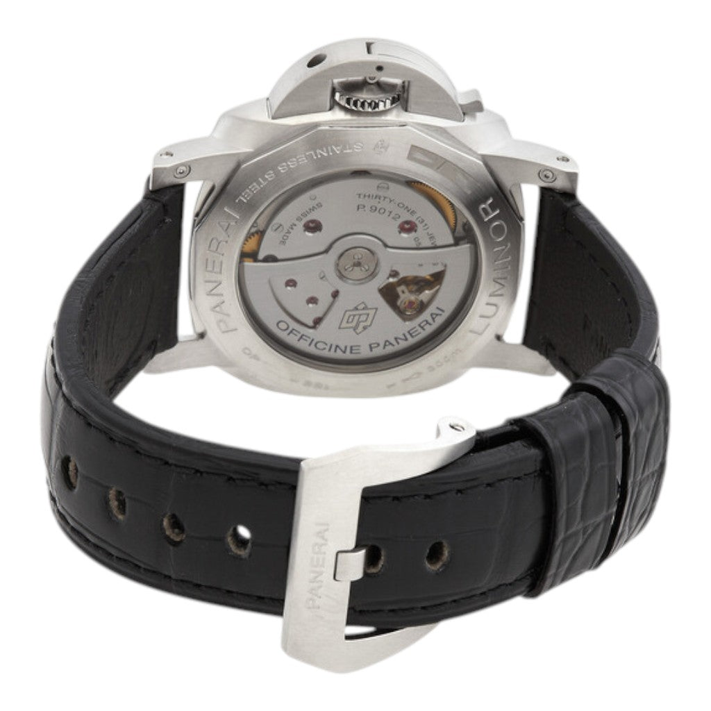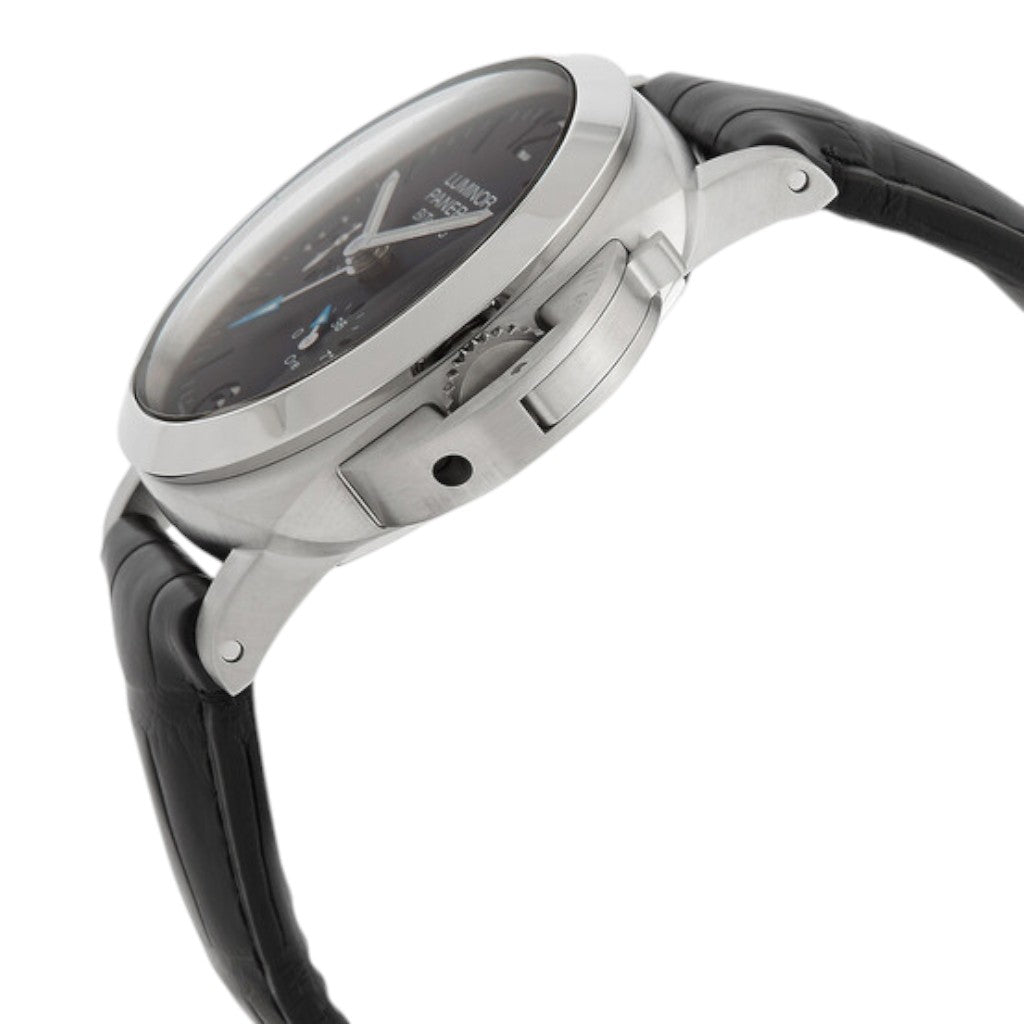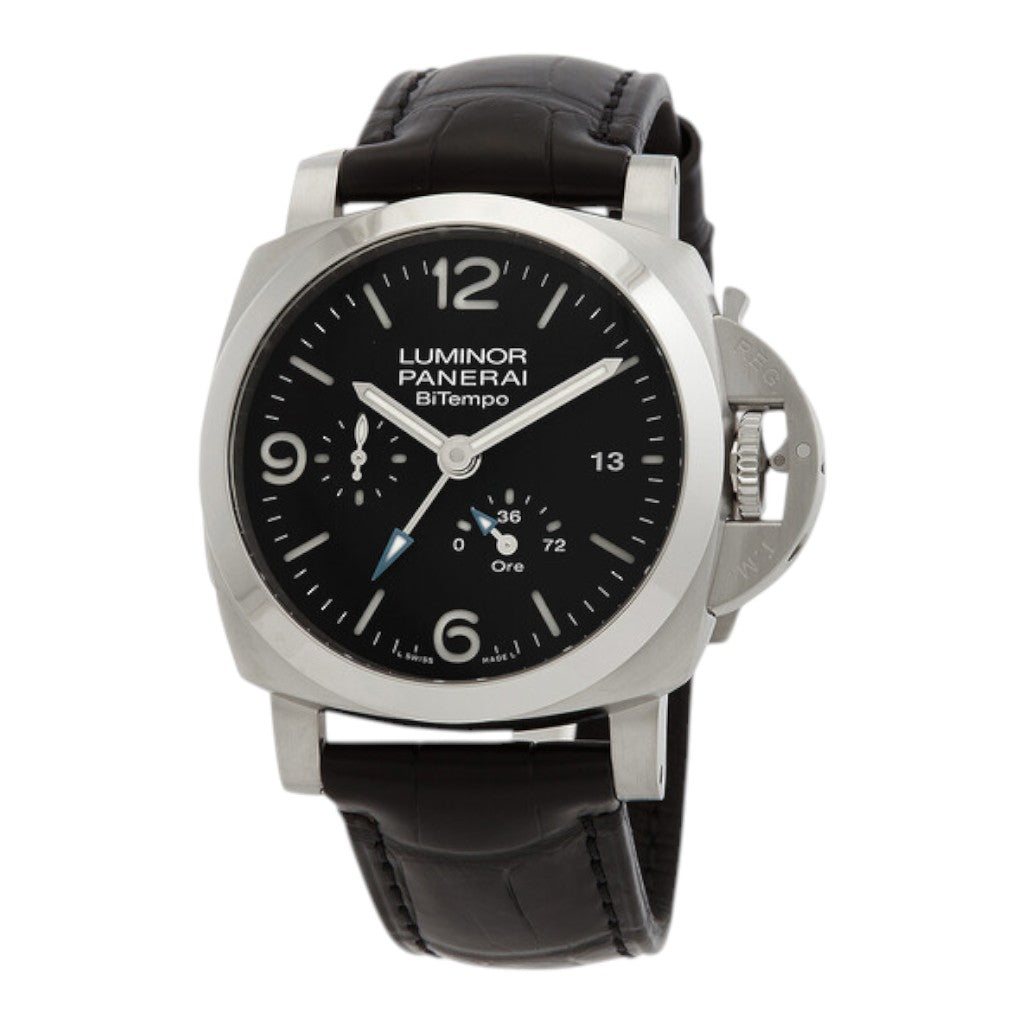 Housed in a 44 mm stainless steel case, the Luminor BiTempo delivers a bold wrist presence while maintaining the classic proportions that define the Luminor family. The iconic crown-protecting bridge reinforces the robust character of the case and enhances water resistance, a hallmark of Panerai’s functional heritage. The clean lines and brushed finish of the case exude understated strength, suitable for both everyday wear and travel.