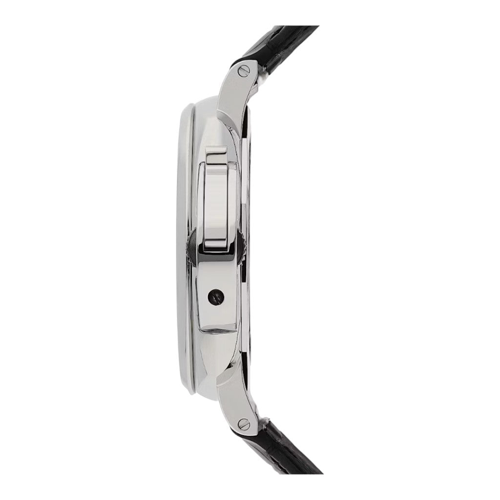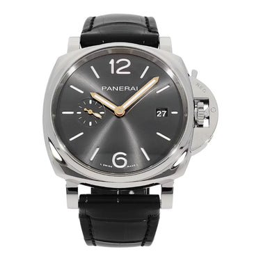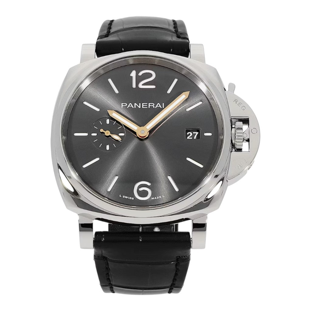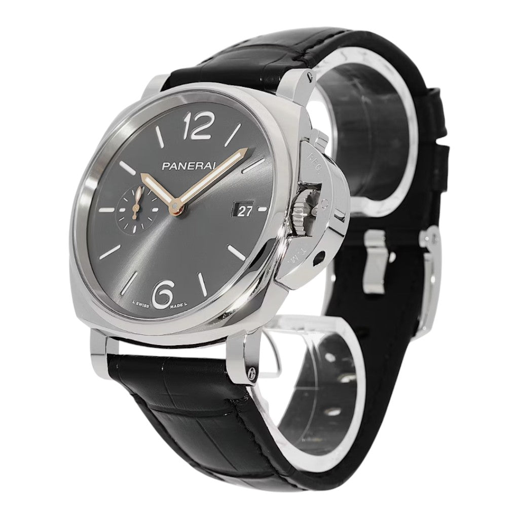 The watch features a 42 mm stainless steel case with polished finishes that enhance its elegant profile. Despite its more streamlined construction compared to traditional Luminor models, it retains the signature crown-protecting bridge, a defining element of Panerai’s design heritage. The grey dial delivers a modern and sophisticated aesthetic, highlighted by luminous Arabic numerals and hour markers for optimal legibility. A small seconds sub-dial at 9 o’clock and a date display at 3 o’clock complete the balanced and functional layout.