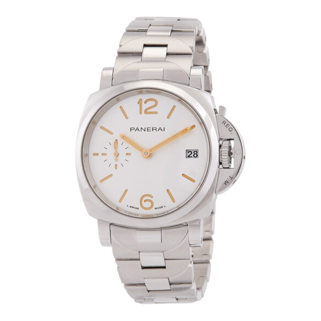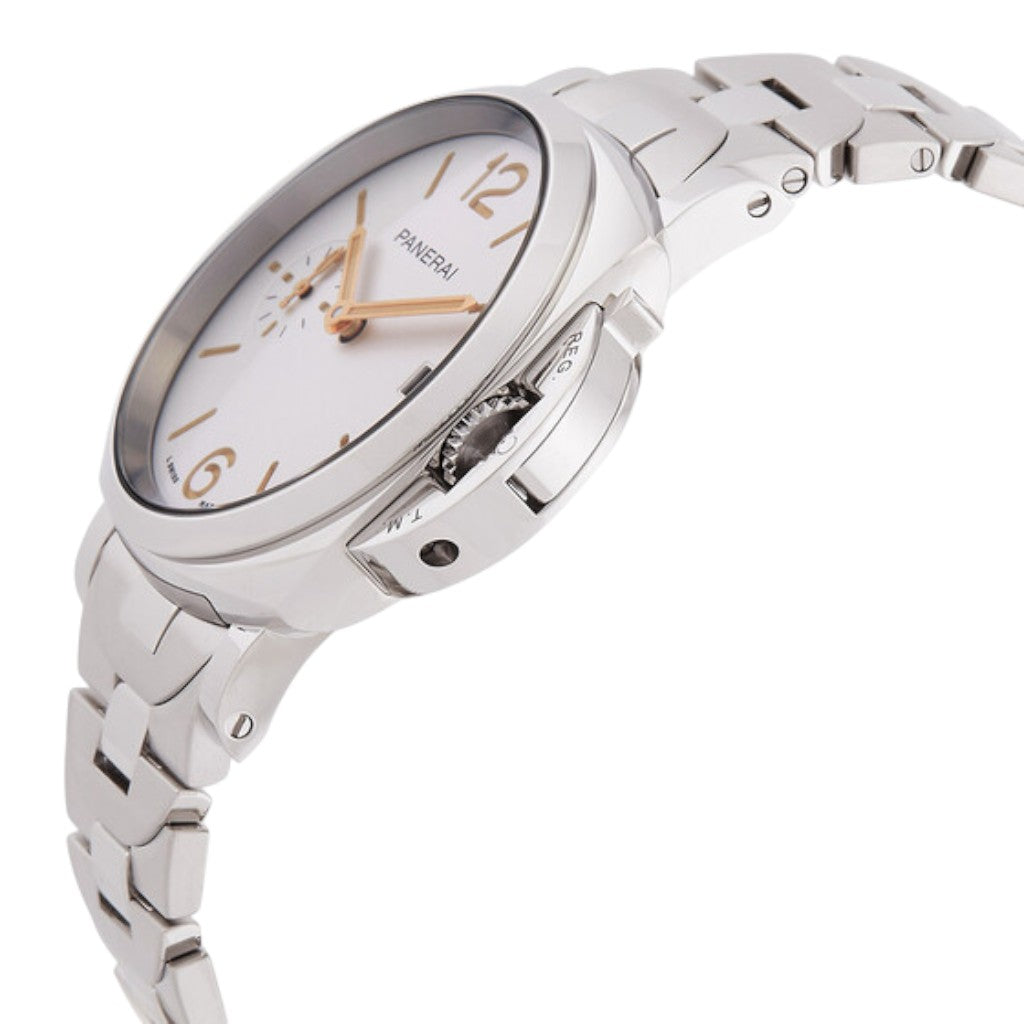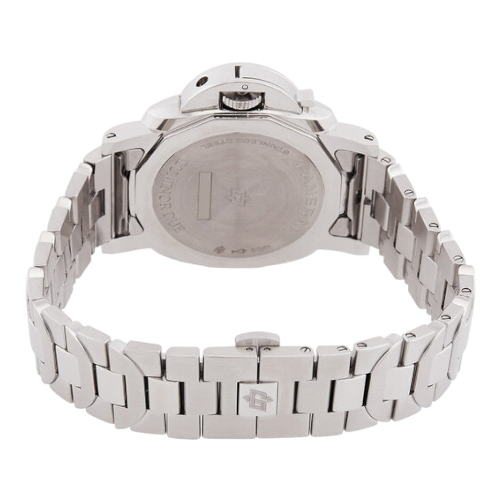 The 38 mm stainless steel case delivers elegant and versatile dimensions, making it ideal for daily wear while maintaining the signature Luminor aesthetic. The polished finishes enhance its refined profile, and the iconic crown-protecting bridge remains a defining element of the design. The silver dial provides a clean and sophisticated appearance, enhanced by luminous Arabic numerals and hour markers that ensure excellent legibility. A small seconds sub-dial at 9 o’clock and a date display at 3 o’clock complete the balanced layout.