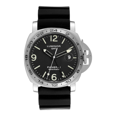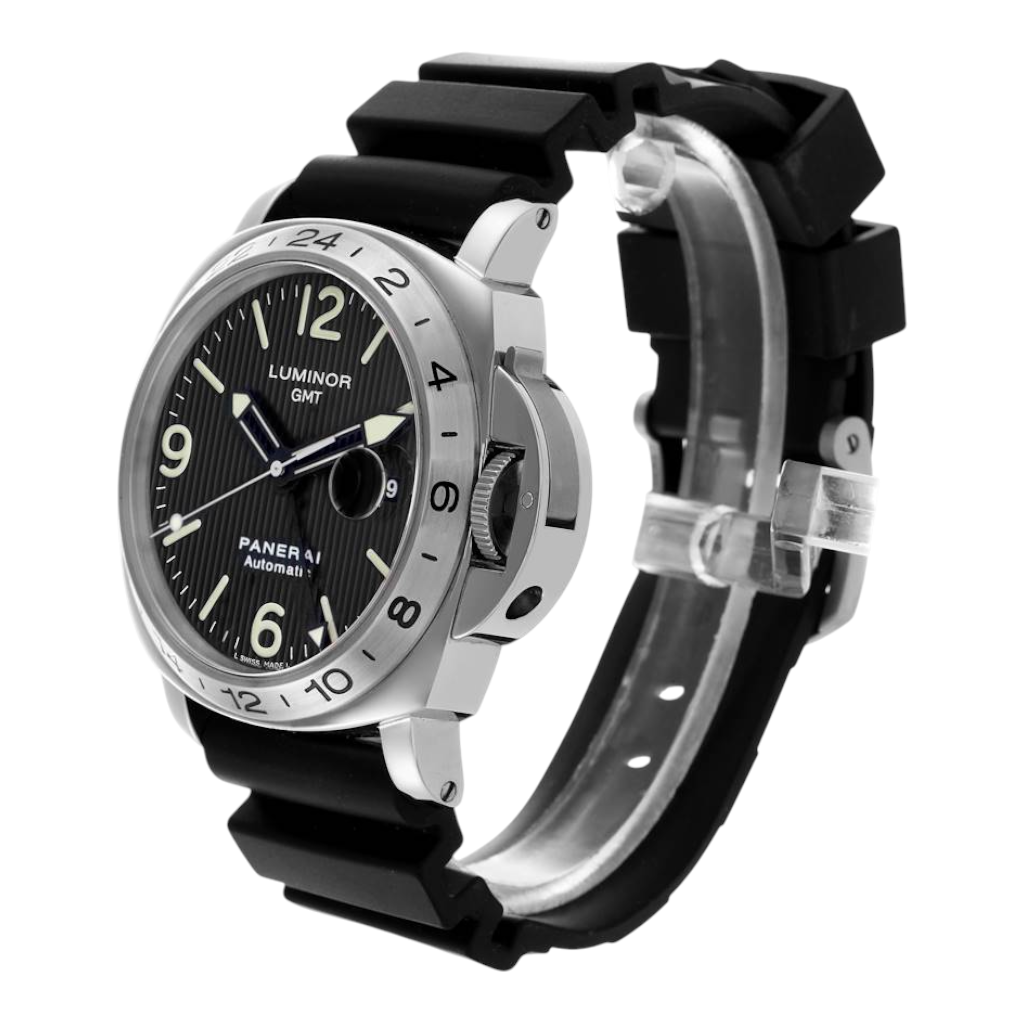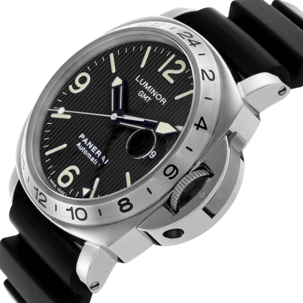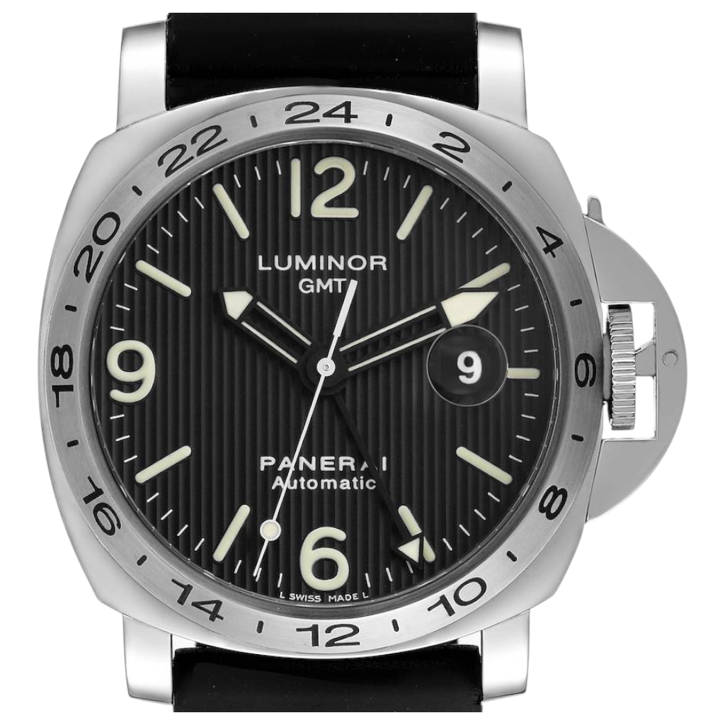 The watch features a 44 mm stainless steel case, shaped in the classic Luminor profile with the signature crown-protecting bridge—an essential element of the brand’s heritage and a guarantee of superior water resistance. The dial is its most iconic trait: a striking black, vertically striped surface paired with luminous Arabic numerals and indices. The central GMT hand allows the wearer to track a second time zone easily, making this model an excellent choice for frequent travellers.