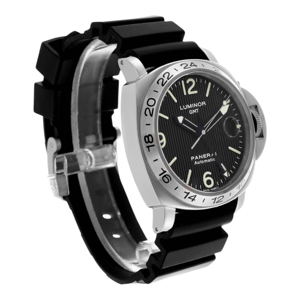 The Panerai Luminor GMT 44mm PAM00029 is one of the most distinctive models in the Luminor collection, recognised for its textured “tuxedo” dial and practical dual-time functionality. Introduced as part of Panerai’s earlier GMT offerings, this reference is appreciated by collectors for its bold aesthetics, reliable movement and unmistakable Panerai identity.