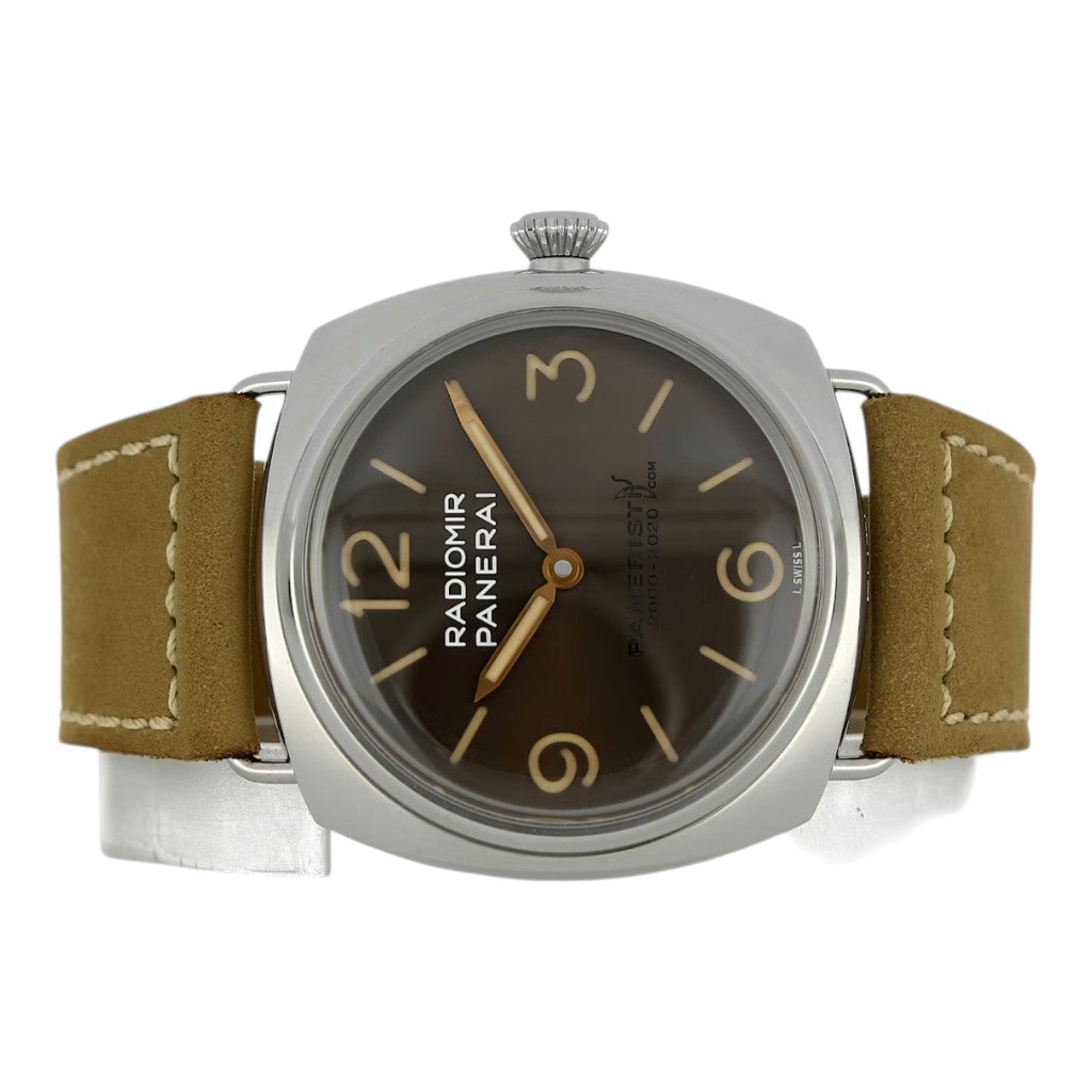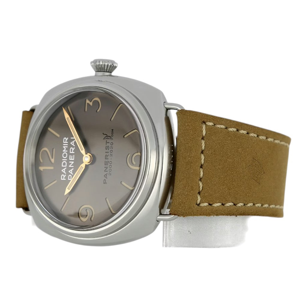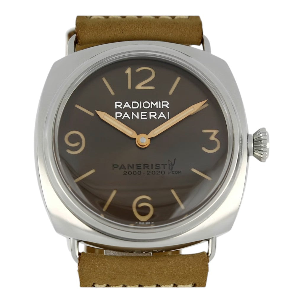 Crafted in stainless steel, the 45 mm Radiomir case features the signature wire lugs and cushion shape, offering a distinctive and timeless wrist presence. The warm brown dial enhances the vintage-inspired aesthetic, with large luminous Arabic numerals and hour markers ensuring excellent legibility. The minimalist layout reflects Panerai’s military heritage, while the “Paneristi” inscription adds a unique commemorative touch.