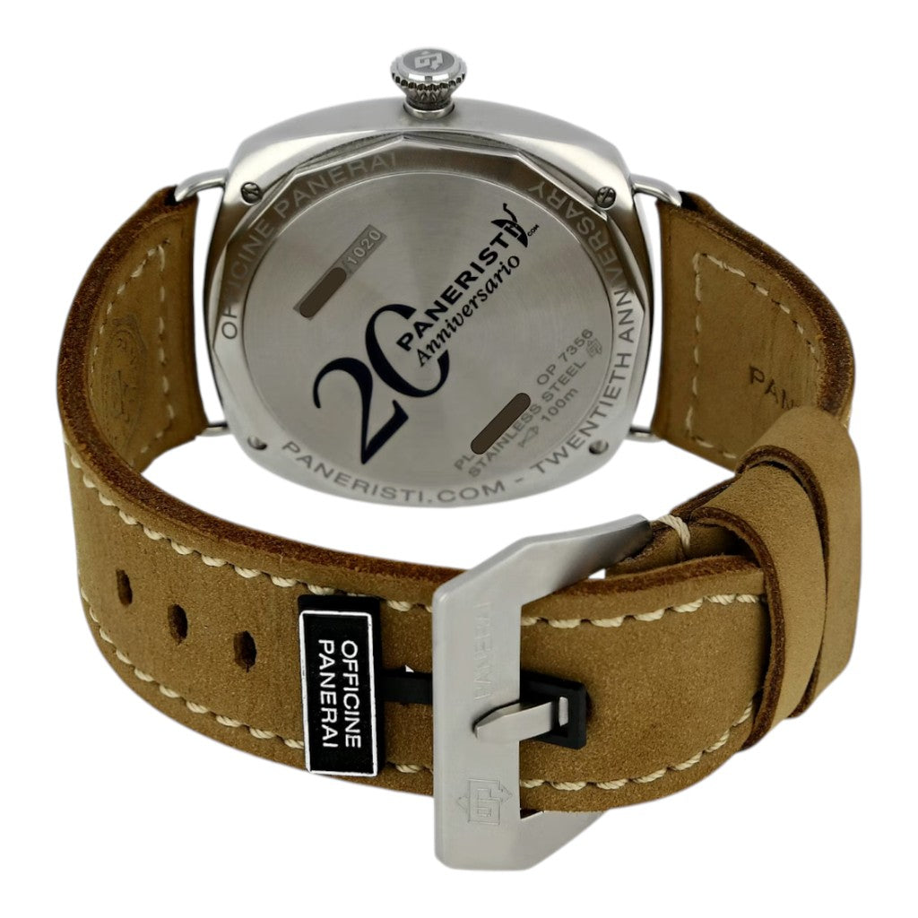 The Panerai Radiomir Venti Paneristi.com reference PAM02020 is a highly collectible limited edition created to celebrate the 20th anniversary of the Paneristi community. Produced in only 1,020 pieces worldwide, this model pays tribute to Panerai’s passionate collector base while staying true to the brand’s historic design codes.