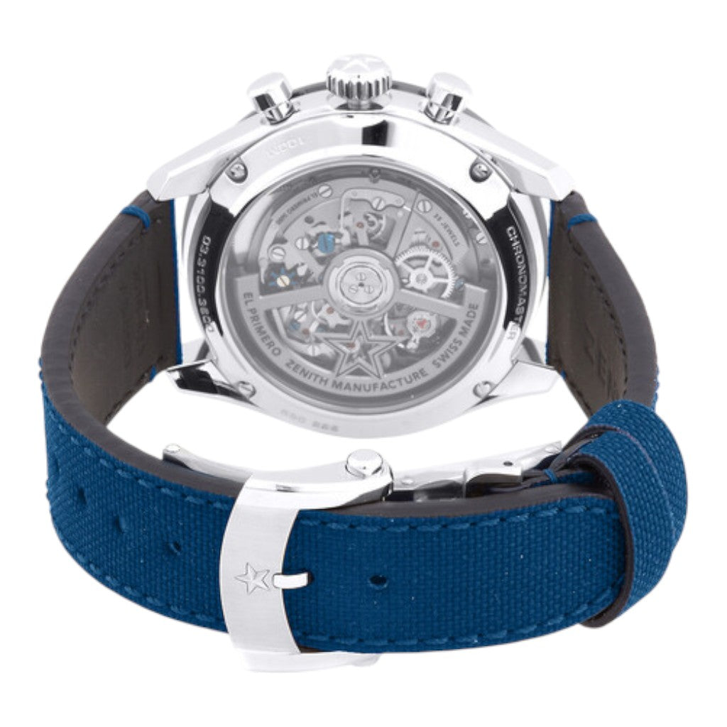 Crafted in stainless steel, the 41 mm case features sharp, athletic lines with polished and brushed finishes, delivering a confident yet refined wrist presence. The black lacquered dial is highly legible and visually striking, distinguished by Zenith’s signature tri-colour chronograph sub-dials (grey, dark grey, and blue). Applied hour markers and faceted hands with luminous treatment ensure clarity in all conditions. A fixed black ceramic bezel engraved with a 1/10th of a second scale reinforces the watch’s performance-driven identity.