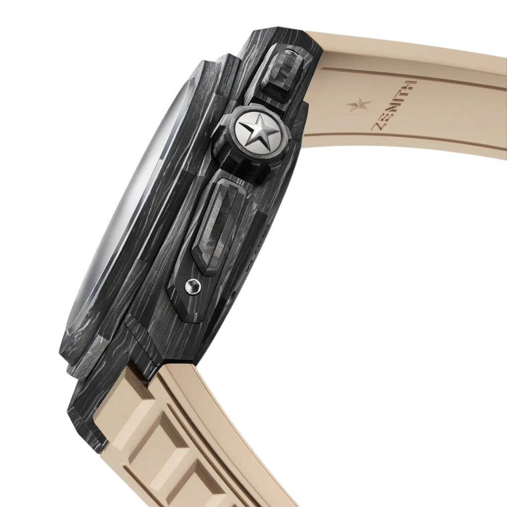 Powering the watch is the Zenith El Primero Calibre 9004, an advanced automatic chronograph movement featuring two independent escapements — one dedicated to timekeeping and one to the chronograph. Operating at 36,000 vibrations per hour, this calibre enables measurement to 1/100th of a second and offers a power reserve of approximately 50 hours for the timekeeping function. The movement can be admired through the sapphire crystal case back.