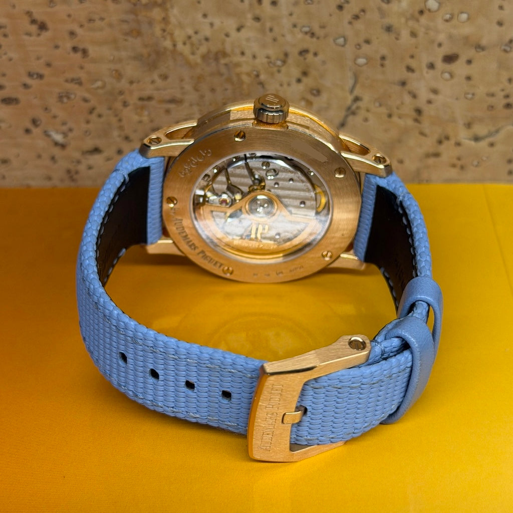 Inside, the watch is powered by the Audemars Piguet Calibre 5900, a slim automatic movement offering a 60-hour power reserve and a frequency of 4Hz, delivering precision and reliability with elegant finishing visible through the sapphire caseback.
