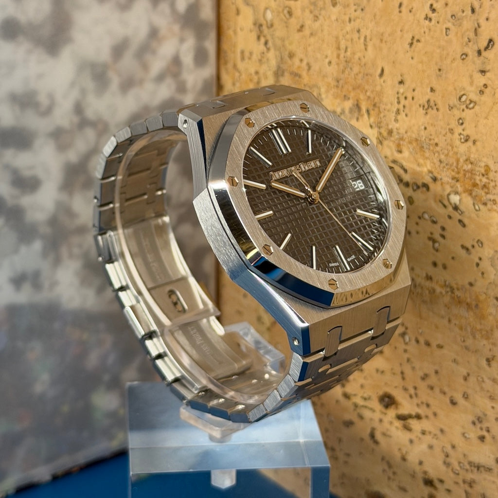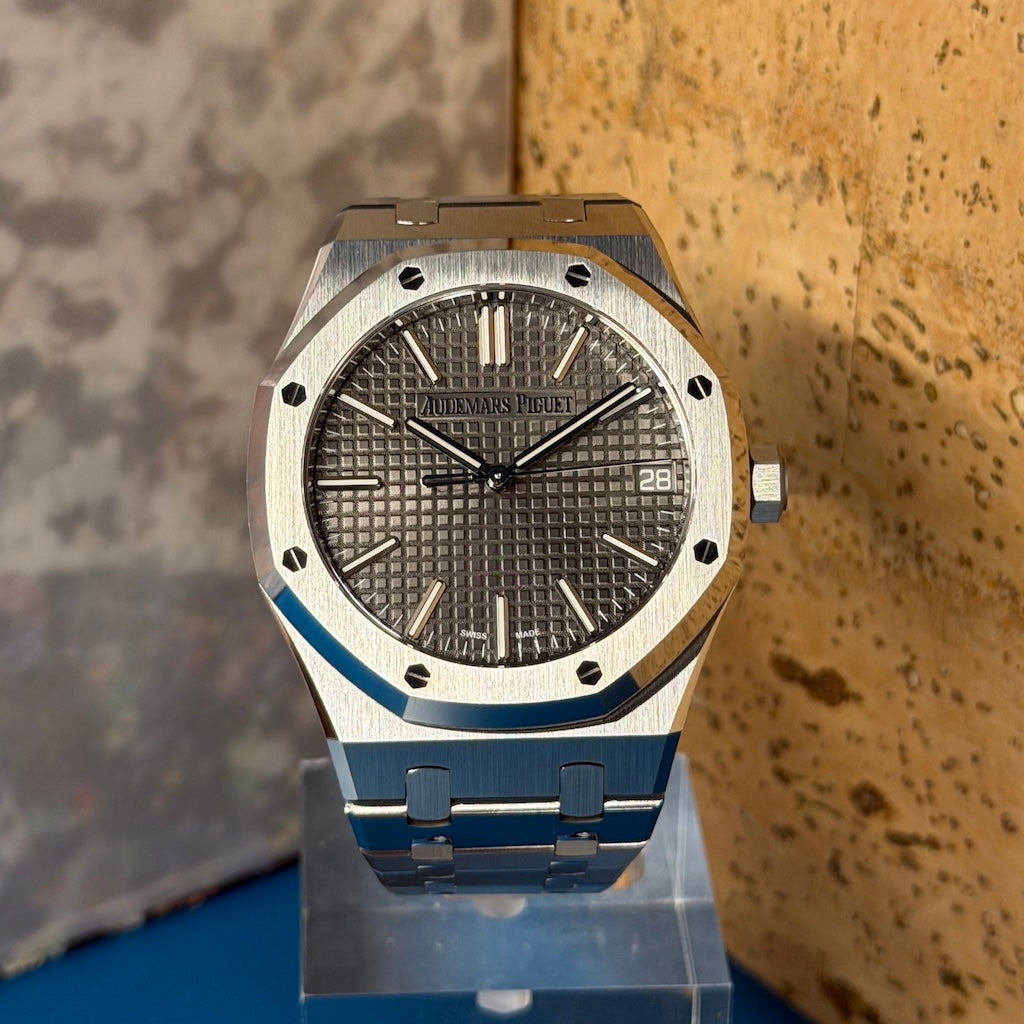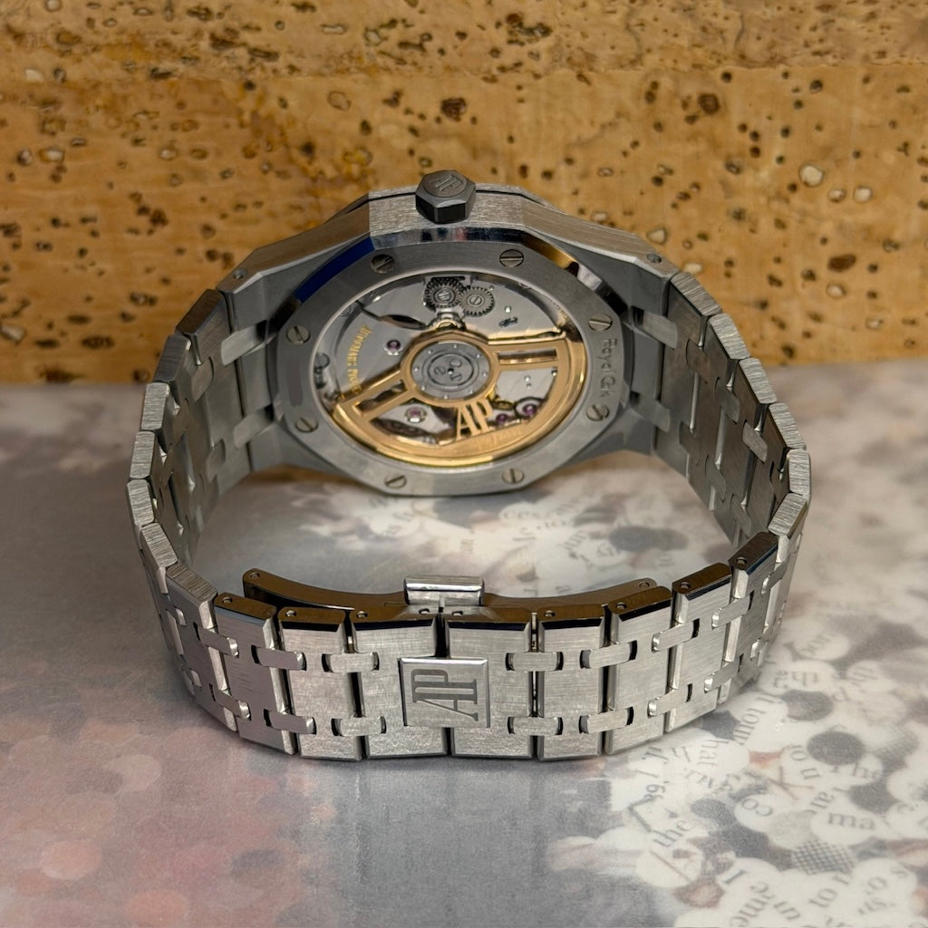 Crafted entirely in stainless steel, the 41mm case features the iconic octagonal bezel secured by white gold screws, satin-brushed surfaces, and polished bevels that showcase the exceptional finishing standards of the Royal Oak collection. The integrated steel bracelet offers outstanding comfort and unmistakable presence on the wrist.