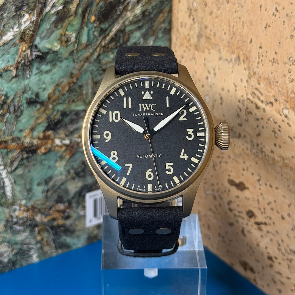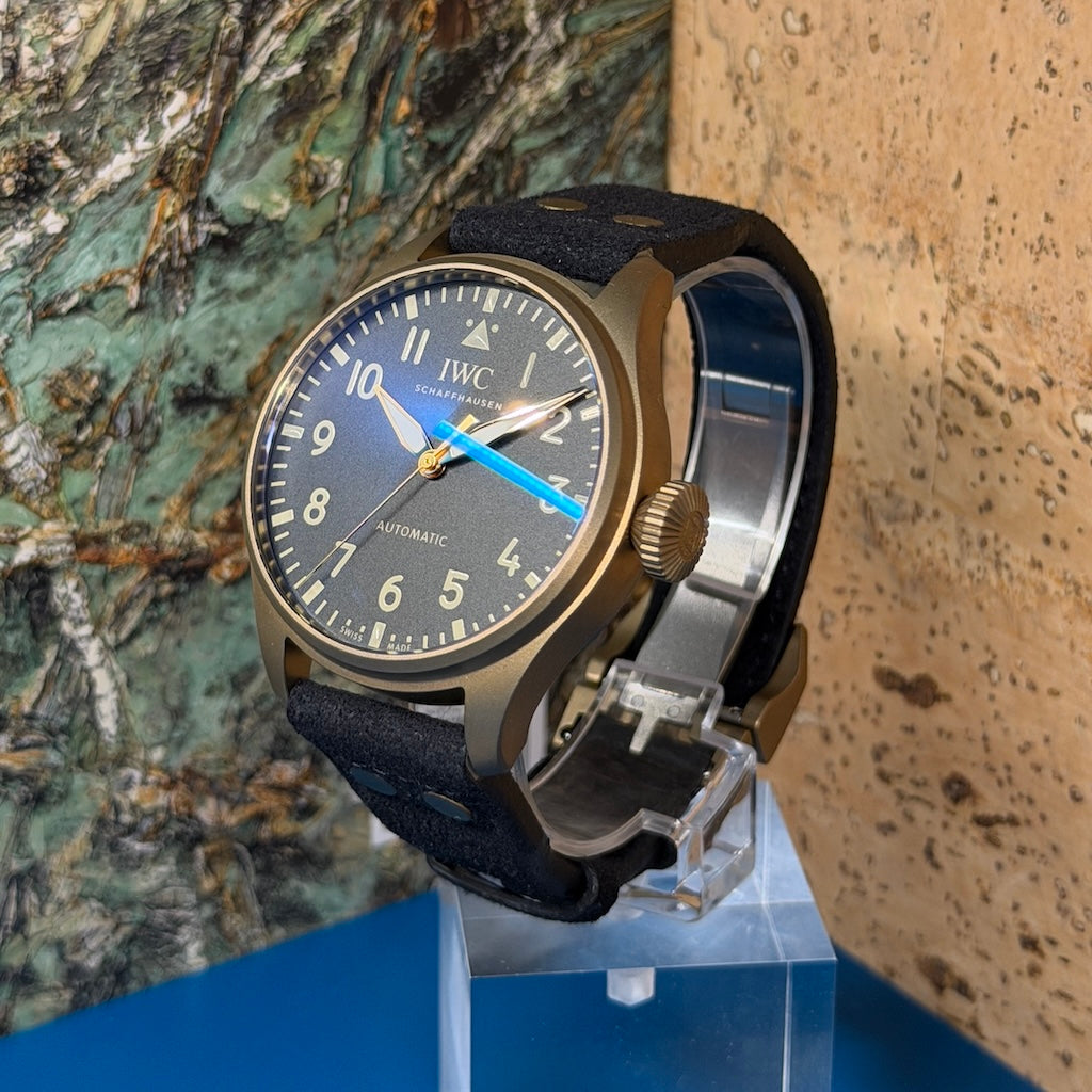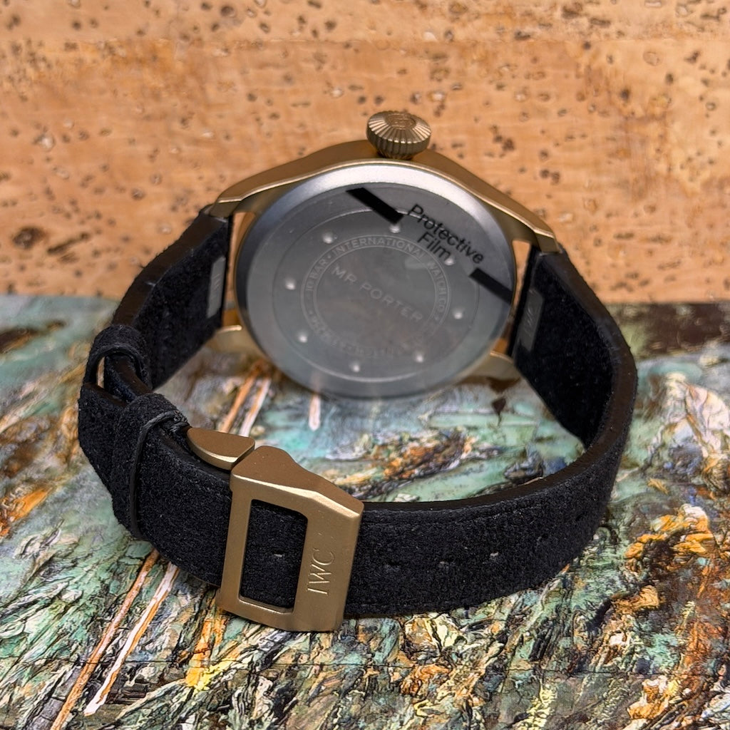 Crafted in matte bronze, the 43mm case offers a warm, vintage-inspired presence that develops a unique patina over time — making each piece truly one of a kind. The titanium caseback and conical crown preserve the Big Pilot’s iconic tool-watch identity, while the reduced 43mm diameter enhances comfort and daily wearability.