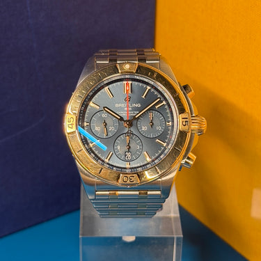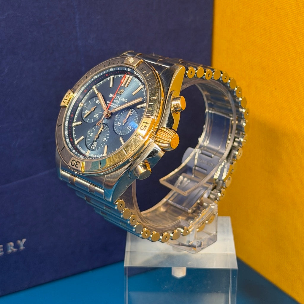 The Breitling Chronomat B01 42, reference UB0134, is a bold and versatile luxury chronograph that combines robust engineering with refined two-tone aesthetics. This 2021 model is offered as a certified pre-owned Breitling, presented in fair condition, and delivered with its full original set, including box and warranty card