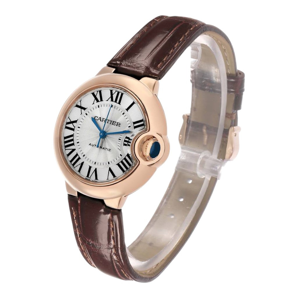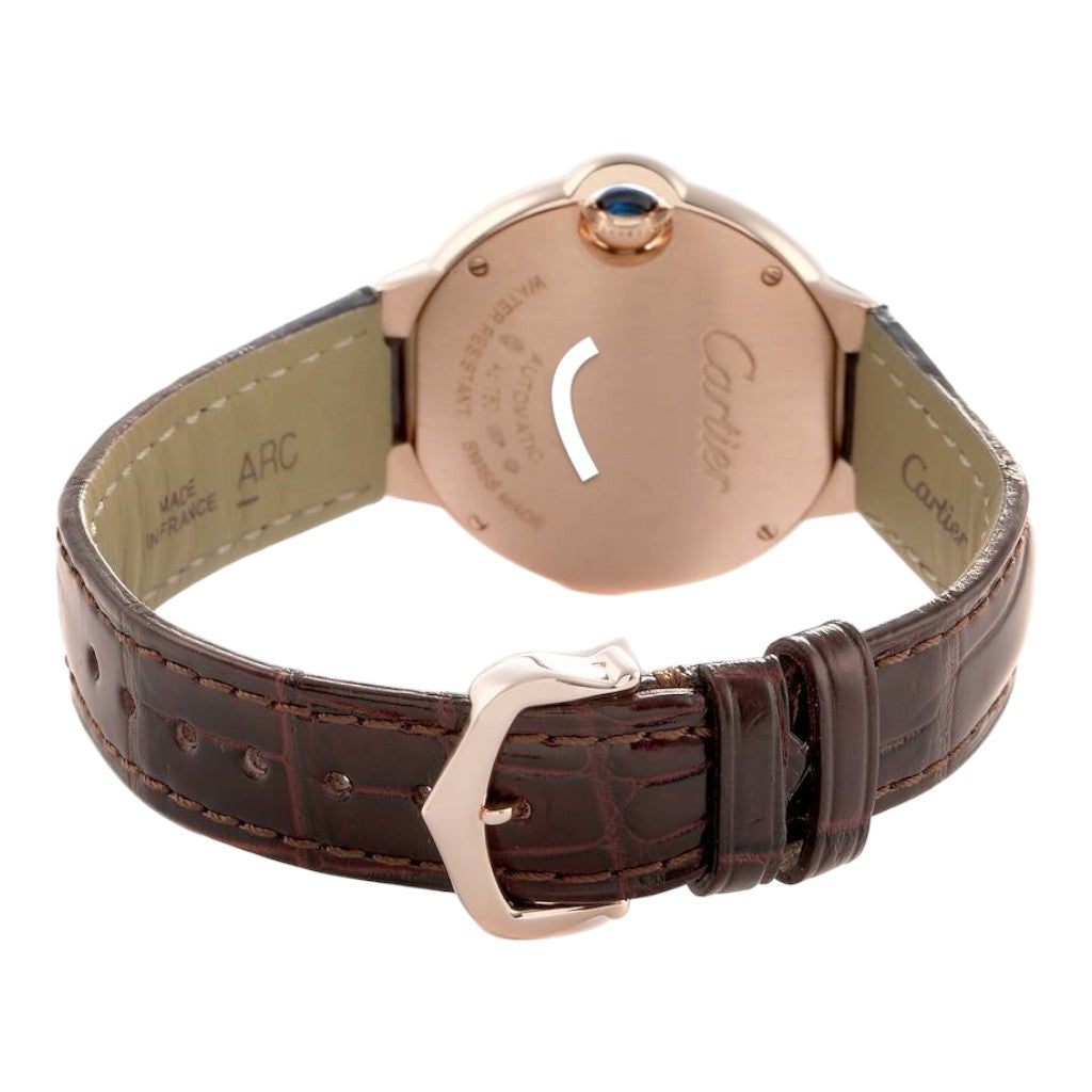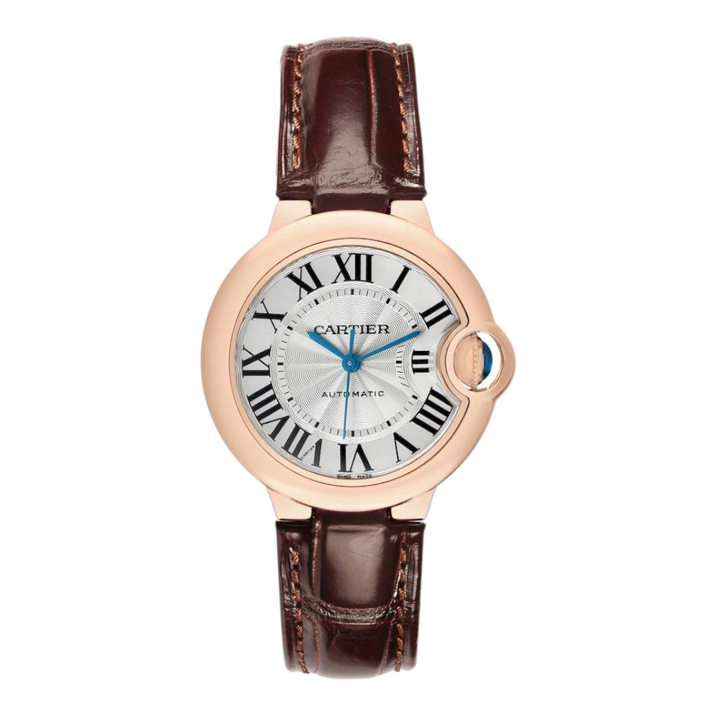 Crafted in 18k rose gold, the 33 mm case offers graceful proportions and a soft, feminine wrist presence. The iconic rounded Ballon Bleu silhouette is instantly recognisable, enhanced by the signature integrated crown guard set with Cartier’s blue sapphire cabochon. Polished surfaces accentuate the fluid lines of the case, giving the watch its distinctive elegance.