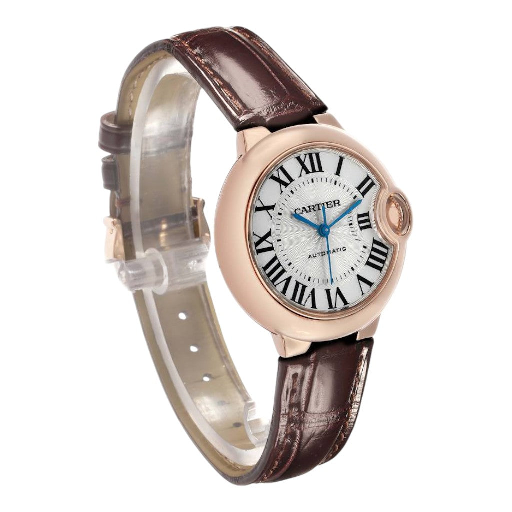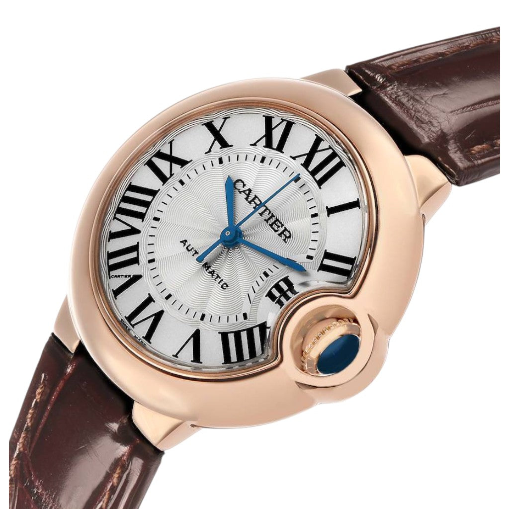 The refined silvered dial remains faithful to Cartier’s classic aesthetic, featuring bold black Roman numerals, a delicate railway minute track, and elegant sword-shaped hands. The harmonious layout ensures excellent legibility while preserving the timeless character that defines the Ballon Bleu collection.