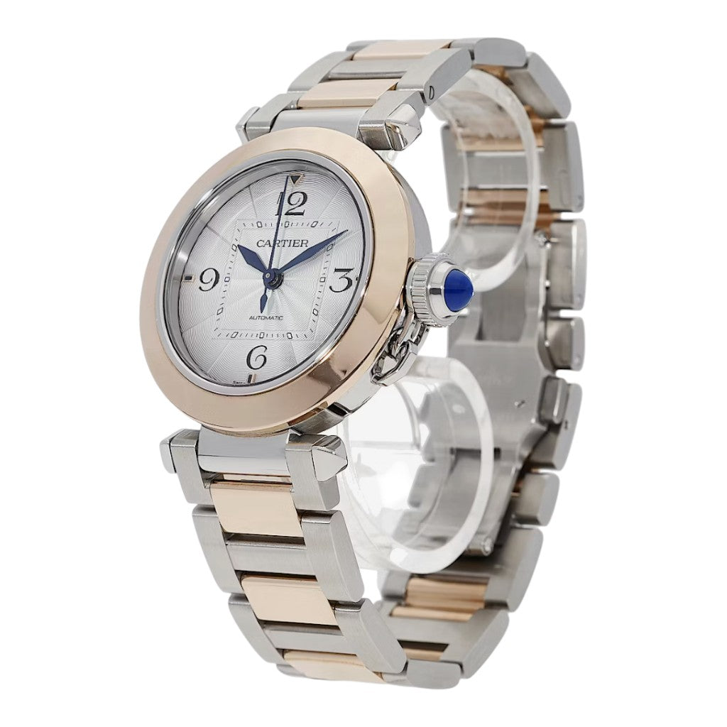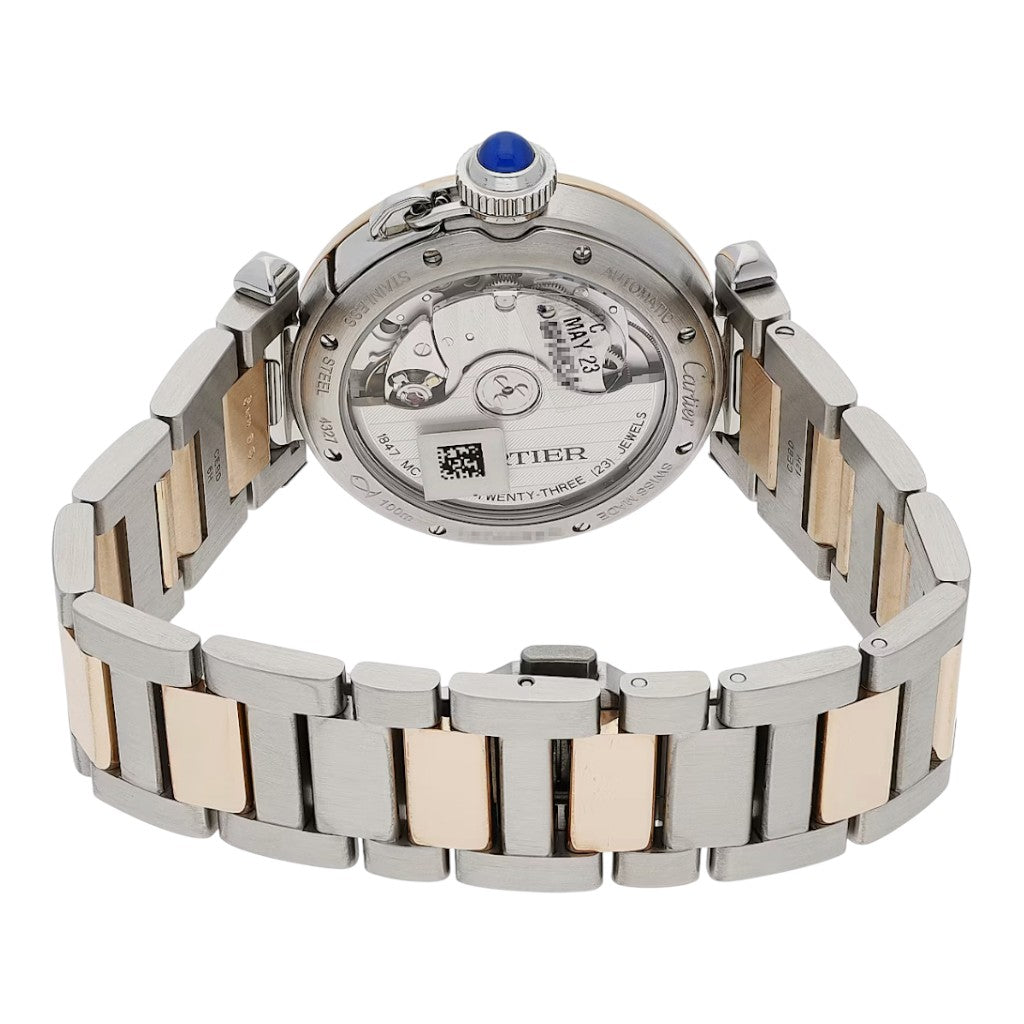Crafted in stainless steel, the 35 mm case delivers balanced proportions that suit a wide range of wrists while preserving the strong identity of the Pasha collection. The iconic screw-down crown cap, secured by a small chain and set with a blue sapphire cabochon, is a defining hallmark of the model. Polished surfaces and a domed sapphire crystal enhance the watch’s elegant yet sporty character.