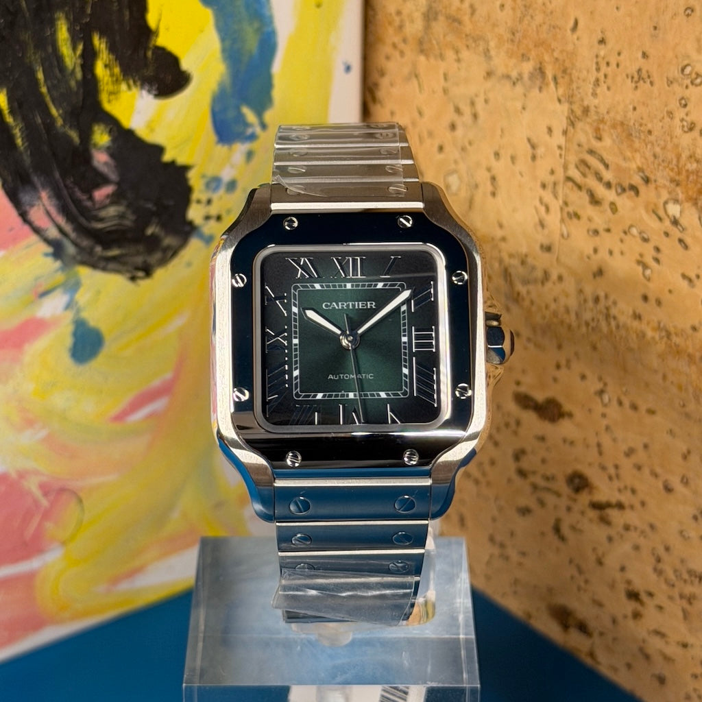 Iconic, architectural, and effortlessly refined, the Cartier Santos Medium, reference WSSA0061, is a bold interpretation of one of Cartier’s most historic watch designs. This certified pre-owned 2024 example is in unworn condition, comes with its original box, and is fitted with a striking green alligator leather strap and Cartier steel buckle. The watch is backed by a valid Cartier international warranty until 2032.
