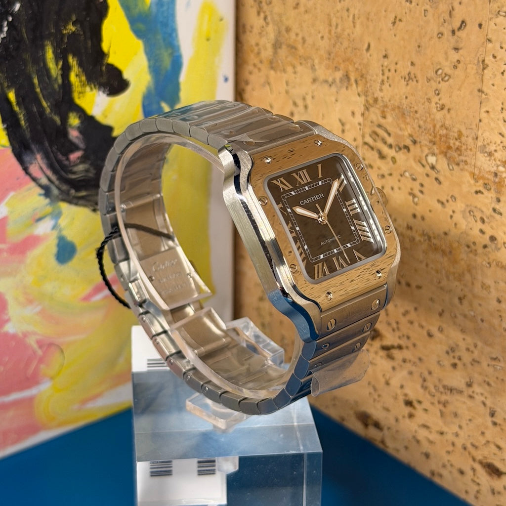 Crafted in brushed and polished stainless steel, the 35.1 mm x 41.9 mm case features the instantly recognizable square silhouette with exposed screws on the bezel — a signature of the Santos line since 1904. This modern version retains all the classic design codes while introducing subtle refinements for a more contemporary fit.