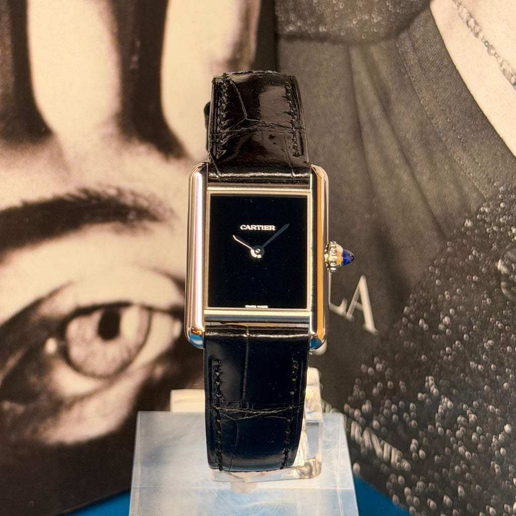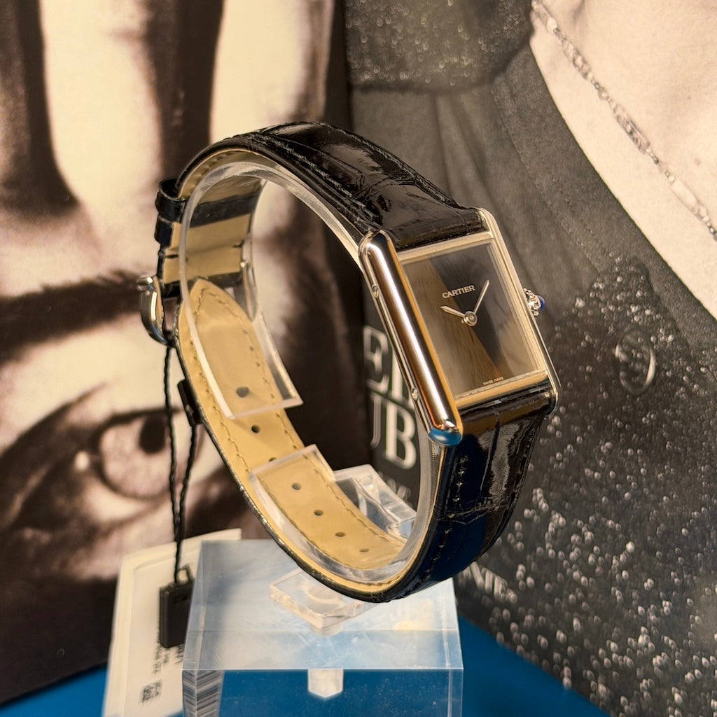 The dial is a true statement piece: a deep black lacquered surface without numerals or indexes, adorned only with silvered sword-shaped hands, highlighting Cartier’s ability to elevate minimalism to high art. This ultra-clean look gives the watch a contemporary feel while honoring the legacy of the Tank design.
